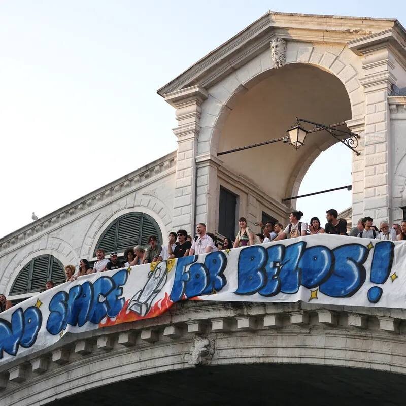 Венеция протестуют против свадьбы Безоса. На мосту Риальто уже появился баннер No Space for Bezos, а на шпиле церкви Сан-Джорджо-Маджоре - плакат с перечёркнутой фамилией миллиардера.