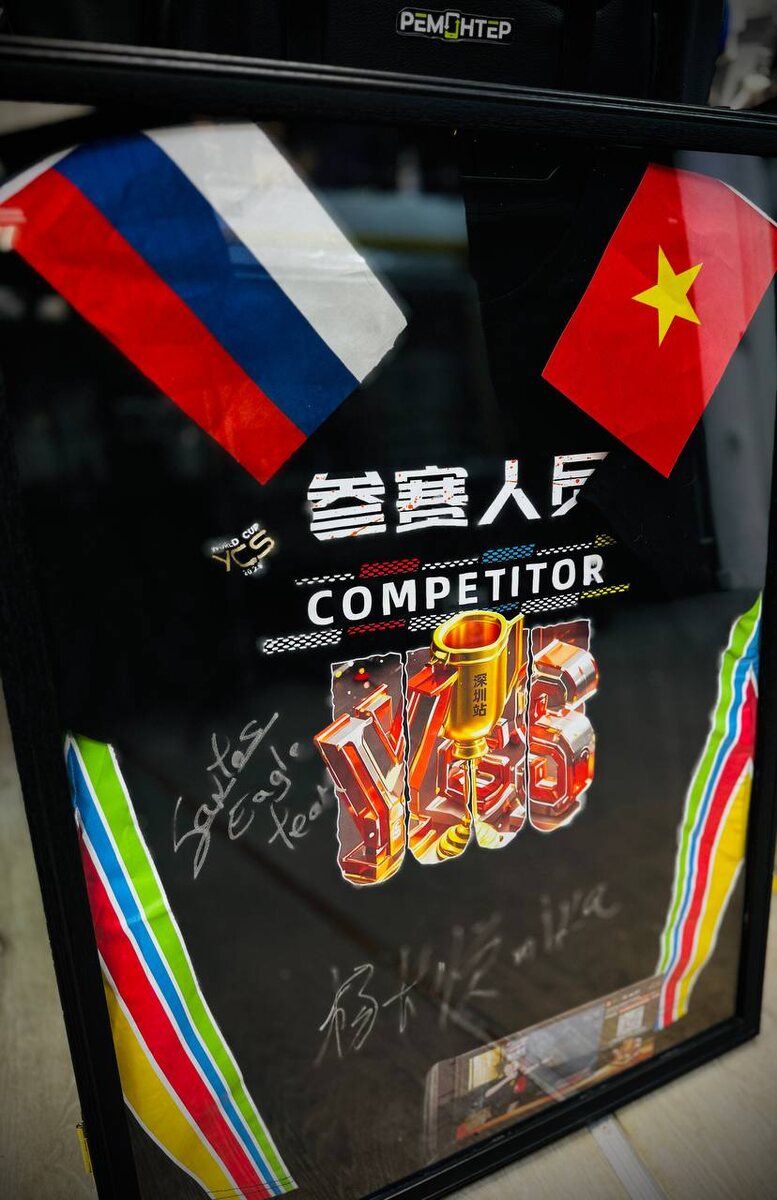 Наконец то пришла рамка для майки!!! И вот в итоге единственная в своем экземпляре майка в которой я участвовал на международных соревнованиях в Китае с росписью Mr.Yang (ycs организатор) и Santos (1е место) заняла свое место !!!