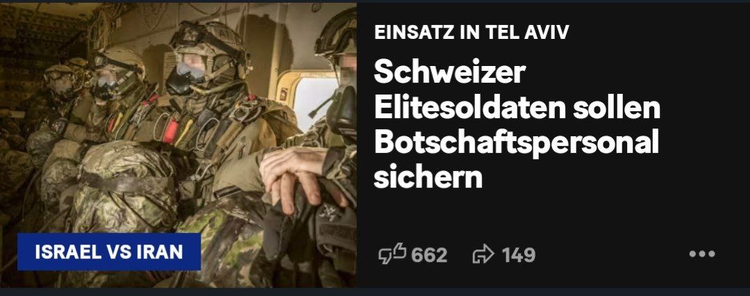 📌 " Швейцарская армия отправила элитных солдат в Израиль для защиты посольства. Посольство Швейцарии в Тегеране находится в опасной ситуации из-за израильских авиаударов. Несмотря на угрозу, посольство выполняет дипломатические обязанности, но остается закрытым для публики " 💬 А чем они помогут при ракетном обстреле ? Или что бы порохом подышали ?