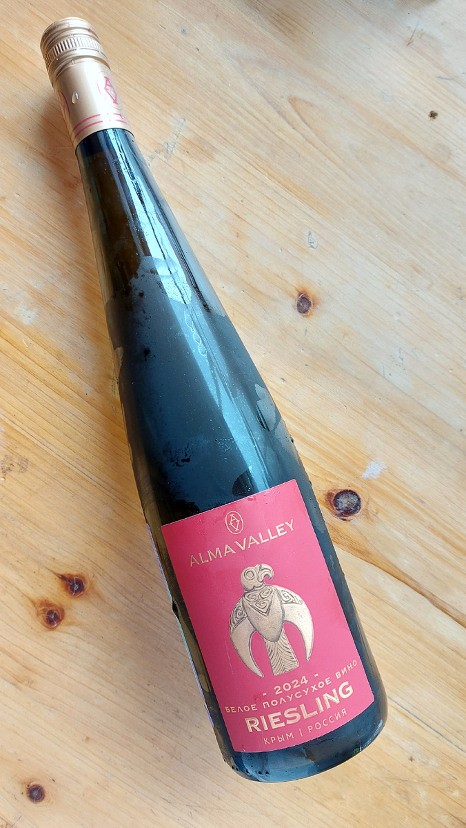 Давно хотел попробовать больше вин от этого известного отечественного производителя. Пока руки доходили по стольку по скольку: попробовал их "летнюю линейку" в белом исполнении, пару ультра-бюджетных вин (красное и белое) из серии "Долина Альмы" и сухой красный СТМ для торговый сетей Lacantita. Между тем, почти все эти вина, будучи весьма бюджетными по задумке, оставили хорошее впечатление. Потому желание попробовать другие вина Alma Valley росло. Выросло это желание в покупку их полусухого Alma Valley Riesling 2024, который сегодня и рассмотрим. Вино продают в мозельской бутылке темно-зеленого стекла. Случайно провел тест на ударопрочность бутылки: она выпала из пакета на кафель с высоты около 40 сантиметров, была полупустой при этом. Падение выдержала с честью, никаких признаков повреждений, крепкая тара. Капсула-винт добротная. Этикетка для данной линейки вин Alma Valley типичная: красная, яркая, с золотыми буквами и индивидуальным изображением из числа скафских золотых находок. В д