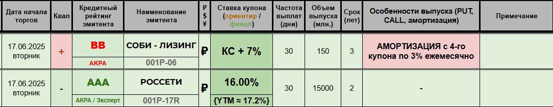 🎅🏻 С новым утром, леди и джентльмены! Вторник принес на наш суд, вкус и цвет несколько бумаг - причем, кажется, первичка будет даже чуть интереснее. Но обо всем по порядку, как водится. ⬇️ Два выпуска начнут торги, а значит после обеда уже найдутся в стакане: 〰️〰️〰️〰️〰️ 🟩 РОССЕТИ 001Р-17R 📊 🅰️🅰️🅰️ (АКРА / Эксперт) 🔹 $RU000A10BT34 ▪️ Купон фиксированный: 16% ✅ Без оферт ▪️ 2 года до погашения ➤ К сожалению, про привлекательность таких бумаг я пока совсем не готов рассуждать. Окей, на процент ниже ключевой еще как-то, но здесь забрали целых четыре купонной премии. Согласится ли дальнейшее развитие событий с такой ставкой - посмотрим, но я в данном случае лишь как теоретик :) По консолидированной отчетности за 2024 год, кстати, убыток, но долгосрочные и краткосрочные долги примерно стабильны - скромные 630 миллиардов в сумме. Вот такие у нас наивысшие рейтинги :) 〰️〰️〰️〰️〰️ 🟥 СОБИ - ЛИЗИНГ 001Р-06 📊 🅱️🅱️ (АКРА) 👨🏫 Только для квалов 🔹 $RU000A10BT00 ▪️ Купон плавающий: КС +