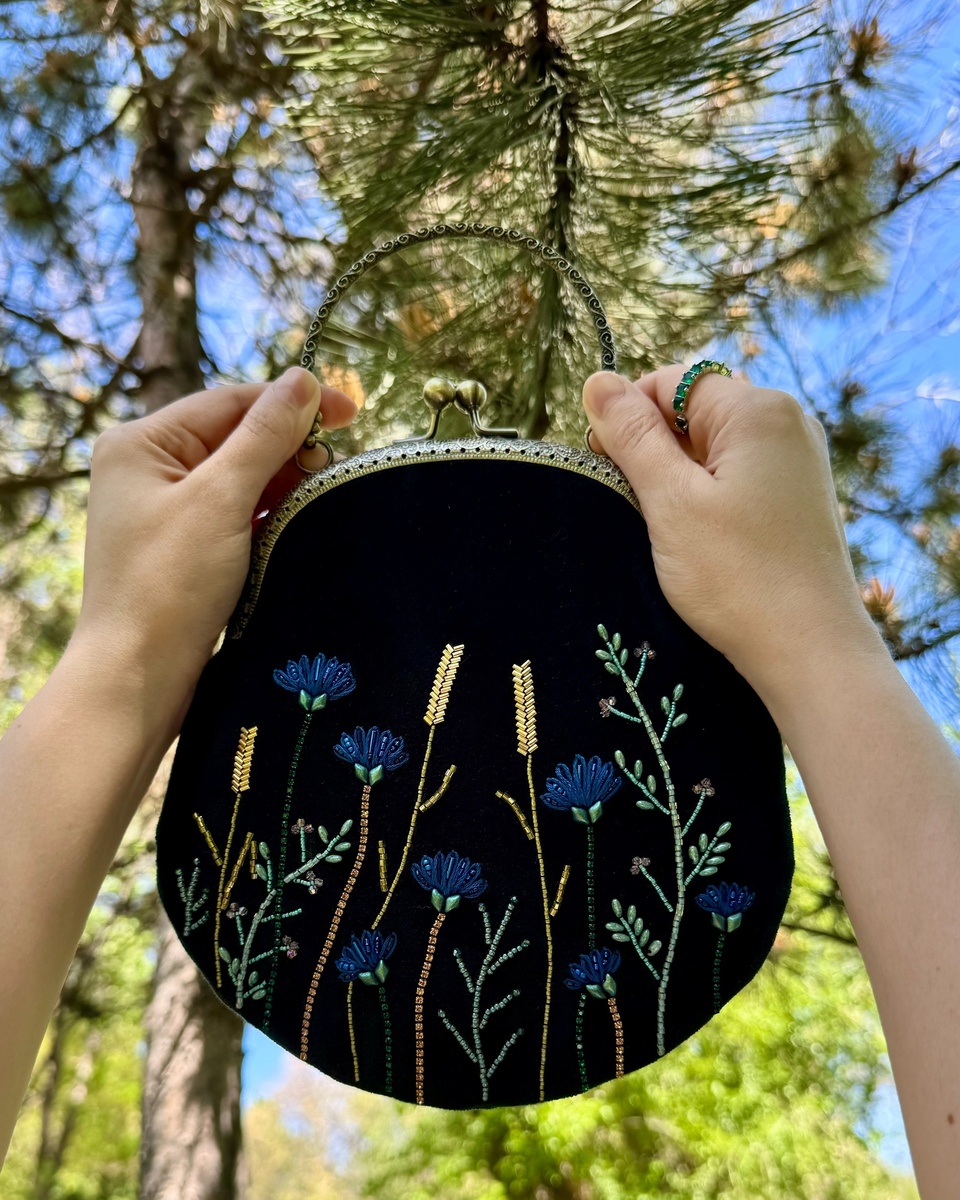Красотка на темно-зелёном бархате с синенькими полевыми. Привет, прекрасные! Бисер — это искусство. Синий в таком минимальном количестве — услада для моих глаз. Ромашки тоже в новом цвете, их ближе позже покажу. А вам как новая модель? Добро пожаловать в мой блог! Я RANISA, дизайнер и преподаватель по вышивке и плетению. Подписывайтесь и будем вместе создавать искусство!