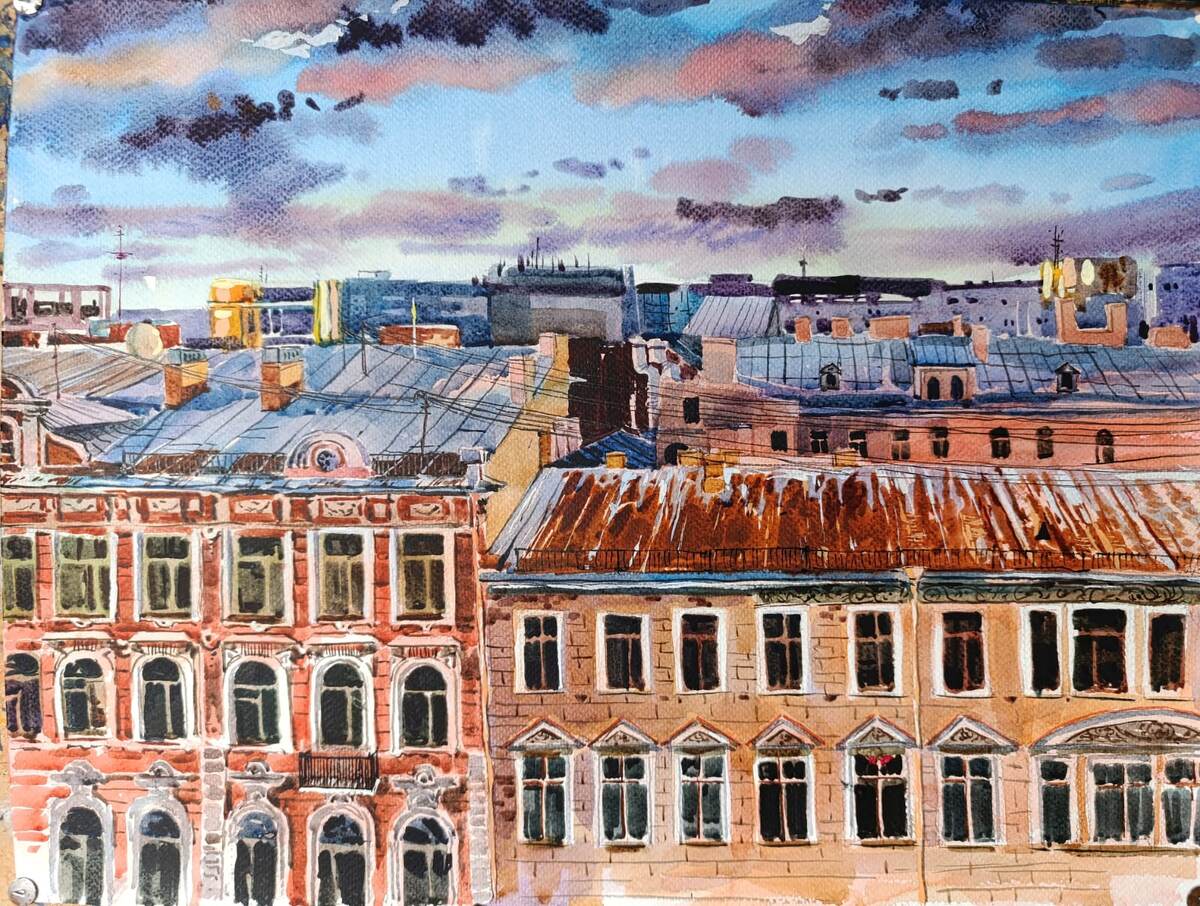 Работа выполнена Акварелью, и дома я уже добавил немного Гуаши, а Линерами прорисовал совсем тонкие детали: антенны домов, ограждения на крышах и провода.