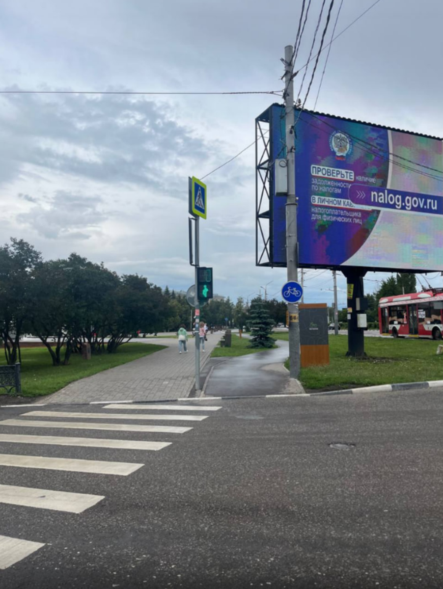 - - столб и светофор стоят практически на велодорожке ( нарушение требований п. 5.3.8 СП 396.1325800.2018).