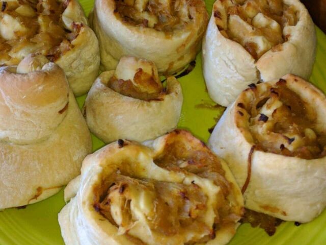 Острые луковые рогалики Рулетики с луком и красным перцем. ⌛ Подготовка: 45 мин. ⏰ Приготовление: 2 час. 25 мин. 🍴 Количество: 1 десяток булочек Ингредиенты ✅ 1 ½ (7.5 гр) пакета активных сухих дрожжей ✅ 1 стакан теплой воды (100-110 градусов) ✅ 1 столовая ложка белого сахара ✅ 1 чайная ложка соли ✅ 1 столовая ложка сливочного масла комнатной температуры ✅ 1 столовая ложка сухого молока ✅ 2 стакана универсальной муки ✅ 1 яйцо, взбитое ✅ 4 луковицы, тонко нарезанные ✅ 4 столовые ложки масла ✅ ½ чайной ложки красного перца. Инструкция приготовления 1. Растворите дрожжи в теплой воде с 1 столовой ложкой сахара. Соедините 1 чайную ложку соли, 1 столовую ложку масла, 1 столовую ложку сухого молока и 2 стакана муки. Добавьте взбитое яйцо и воду для расстойки дрожжей. Переложить тесто в смазанную жиром миску и накрыть смазанной полиэтиленовой пленкой. Дайте тесту подняться до увеличения в два раза, около 1 часа. 2. Растопите 4 столовые ложки сливочного масла в сковороде на среднем огн