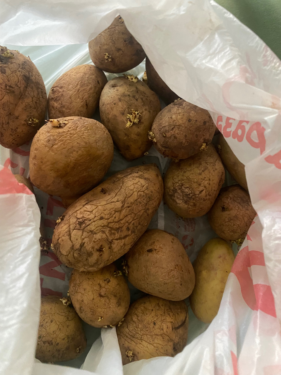 Картофель не с мусорного бака, но на выброс, сестрица в магазине помогает что то сделать, а ей вот отдают не деньгами, а что выбрасывают.