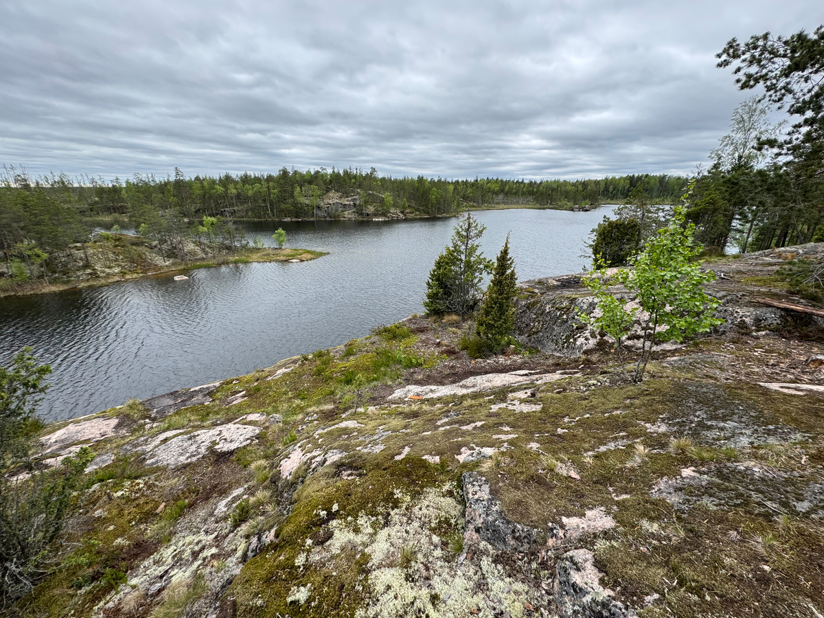афише спектакль сменился другим — ровно по расписанию. Ветер неожиданно стих, небо тут же прояснилось, рухнул тент серебристой облачности и от макушек сосен начала разливаться насыщенная синева. Озеро застыло и превратилось в слюдяное зеркало, в котором вдруг выросли скалы вниз головой. К закату на небе не осталось почти ни одного облака, и теперь солнце, прятавшееся весь день, могло беспрепятственно нырнуть в лес, ослепив нас светом. Могло, но не нырнуло. Ведь июньское солнце в наших широтах особенное. Оно не