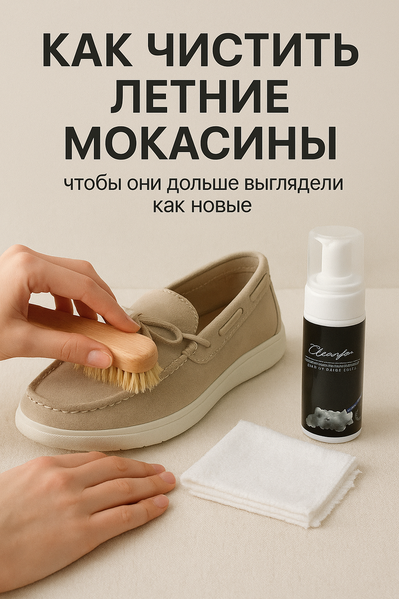Летние мокасины — удобная и лёгкая обувь, идеально подходящая для повседневной носки. Но именно из-за частого использования они быстро теряют внешний вид: появляются пятна, загрязняется подошва, материал выцветает. Важно не просто «освежить» обувь, а ухаживать за ней грамотно — с учётом материала и особенностей конструкции. Первое правило — не откладывать чистку. Как только вы вернулись домой, мягкой сухой щёткой удалите поверхностную пыль. Особенно важно это для замшевых и текстильных моделей: засохшие загрязнения потом сложнее убрать без риска повредить материал. Для летних мокасин нельзя использовать агрессивную бытовую химию — она может оставить разводы или испортить цвет. Лучше всего использовать специальные средства для ухода за обувью, например пену Cleanfor: она безопасна для текстиля, нубука и кожи, глубоко очищает и не нарушает структуру ткани. Как правильно чистить: Белая подошва — главный маркер «ношеной» обуви. Вернуть ей чистоту можно с помощью меламиновой губки или спец