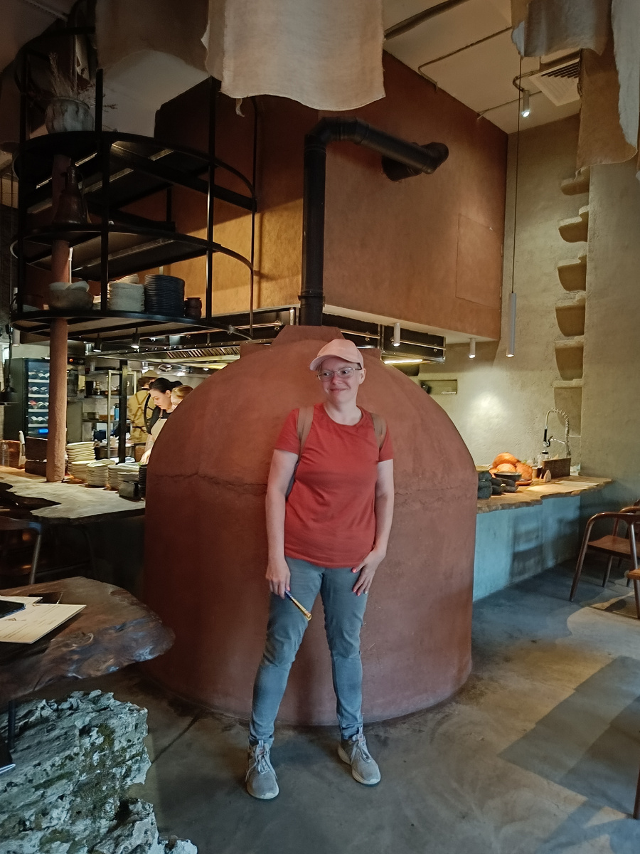 Прогуливаясь по Казани, мы набрели на заведение, вход в которое было украшено рунами, нанесёнными на тканное полотно. Заведение притаилось в кармашке улицы Баумена (кто такой Баумен хоть все знают? Если что, вкратце, потом, расскажу в другом посте) и явно не стремится к широкой рекламе. Я вообще люблю всякое "этно", шаманов с бубнами, и прочее подобное. Прямо на нас надвигалось очень злое облако. Оно наливалось темно-синим и угрожало дождём. И тут к нам вышел "представитель мира духов", а точне - милая сотрудница заведения. Это кафе-ресторан, оказывается). Я сначала думала, что музей. В основе бренда лежит легенда о птице Самрук, которая живёт в кроне Дерева Жизни и откладывает золотое яйцо-солнце каждое утро. А с наступлением темноты солнце поглощают другие духи, хозяева ночи. Блюда там готовят на открытом и закрытом огне. Имеется глинянная печь. Общий дизайн сообщает о традициях и мифах разных народов, проживавших раньше на территории современной России. Интерьер заведения дем