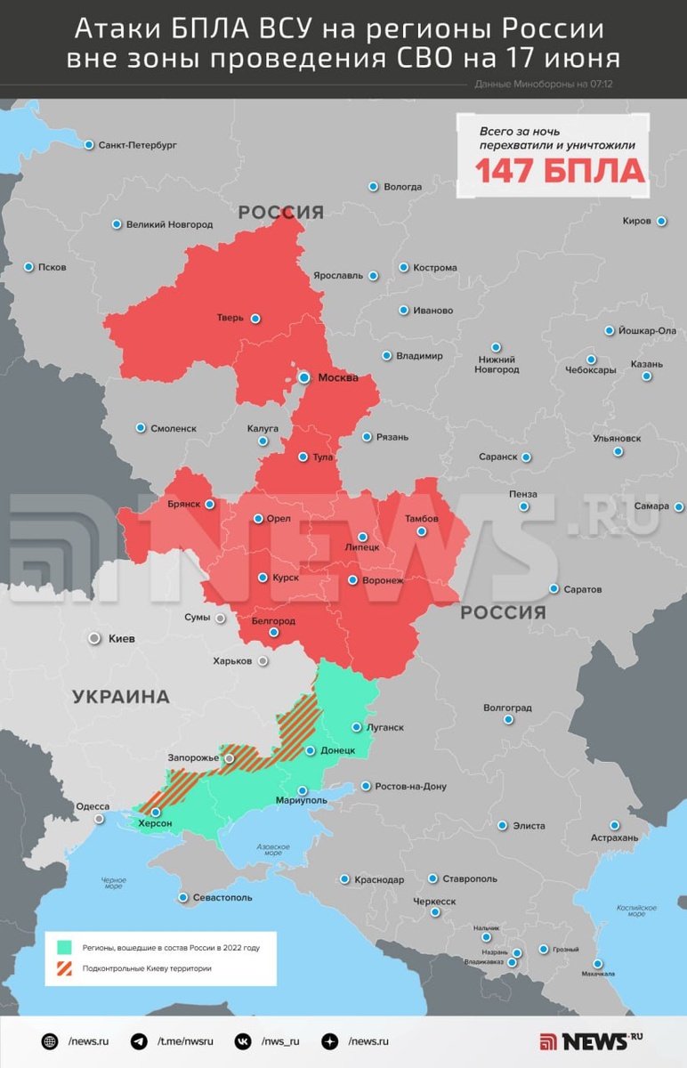 Российская ПВО за ночь уничтожила 147 украинских беспилотников, сообщили в Минобороны. БПЛА сбивали над Белгородской, Курской, Брянской, Воронежской, Тверской, Липецкой, Орловской, Тамбовской, Тульской областями, а также над Московским регионом. ⭕️ Подписаться | Прислать новость | Буст