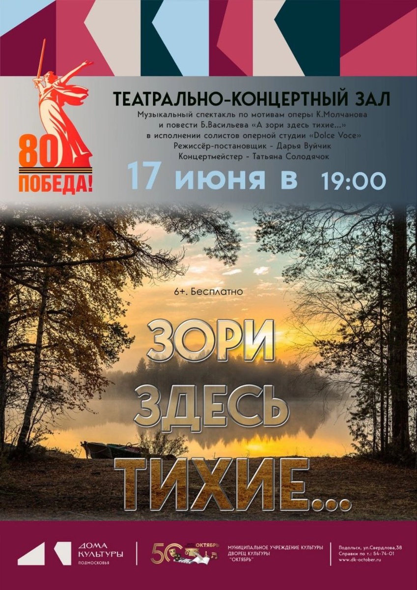 ✨ Повтор спектакля «А зори здесь тихие…» 🎶Музыкальный спектакль по мотивам оперы К.Молчанова и повести Б.Васильева «А зори здесь тихие…» в исполнении солистов оперной студии «Dolce Voce» ⏳Продолжительность: 90 минут 🚫 Возраст: 6+ 📆 17.06.2025 🕒 19:00 🏢 Дворец культуры «Октябрь» 📍 г. Подольск, ул. Свердлова, д.38 💰 Вход свободный❗️ #webПодольск ⭐Разместить публикацию ⭐Поддержать канал голосом ✅ Мероприятия Подольск https://dzen.ru/id/66ed500f7b5671493eca3fd6 http://vk.com/podolsk_events http://dzen.ru/podolsk_events