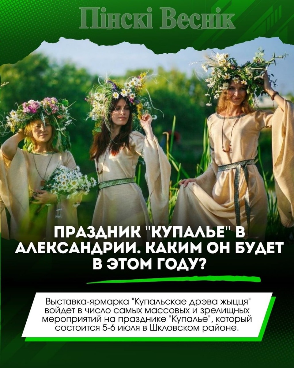📌Республиканский праздник "Купалье" ("Александрия собирает друзей") традиционно пройдет на берегу реки Днепр. ✔️Эта локация с древних времен объединяла восточнославянские народы, была артерией знаменитого пути "из варяг в греки". Ежегодно праздник собирает несколько десятков тысяч гостей, профессиональных и любительских творческих коллективов, мастеров декоративно-прикладного искусства. 📍📍@Пинский Вестник ЮТУБ | САЙТ| ИНСТ | ВК | ОК | ФЕ | Прислать новость