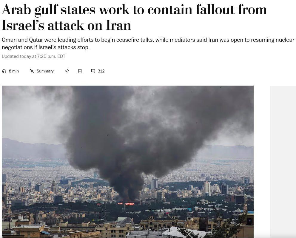 Иран выдвинул условие США для возобновления переговоров по ядерной сделке. Представители исламской республики заявили посредникам, что готовы пойти на диалог, но сначала хотят, чтобы Израиль прекратил свои атаки. Усилия по началу переговоров о прекращении огня возглавили Оман и Катар. Позиция Тегерана, по словам одного из чиновников, заключалась в том, что «мы никогда не выходили из-за стола переговоров, но никаких переговоров, пока мы находимся под огнем». Президент Дональд Трамп указал, что он получил сообщения о том, что Иран стремится остановить боевые действия, но не сказал, просил ли он Израиль остановиться или разгласить, намерены ли Соединенные Штаты вмешаться в военные действия от имени Израиля, — пишет Washington Post.