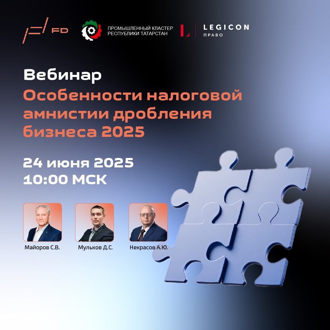 Вебинар: «Особенности налоговой амнистии дробления бизнеса 2025» 📅 24 июня 2025 года | ⏰ 10:00 МСК Меняются законы — время использовать это с пользой для компании. Программа налоговой амнистии дробления бизнеса, запущенная по инициативе Президента РФ В.В. Путина, даёт возможность компаниям легализовать свою структуру без штрафов и доначислений налогов за 2022–2024 годы. Если у вас несколько юридических лиц, созданных для оптимизации налогов, сейчас вы можете безболезненно навести порядок в структуре и минимизировать риски. 💡На вебинаре обсудим: 1️⃣Основные условия и возможности применения налоговой амнистии 2️⃣Подход налоговых органов и налоговых консультантов к амнистии 3️⃣Как избежать доначислений, пеней и штрафов за прошлые периоды 4️⃣Юридические и налоговые нюансы объединения группы компаний 5️⃣Реальные кейсы и практические рекомендации Спикеры: ⚫️Майоров Сергей Васильевич — советник министра промышленности и торговли, Председатель Правления Промышленного кластера Республик