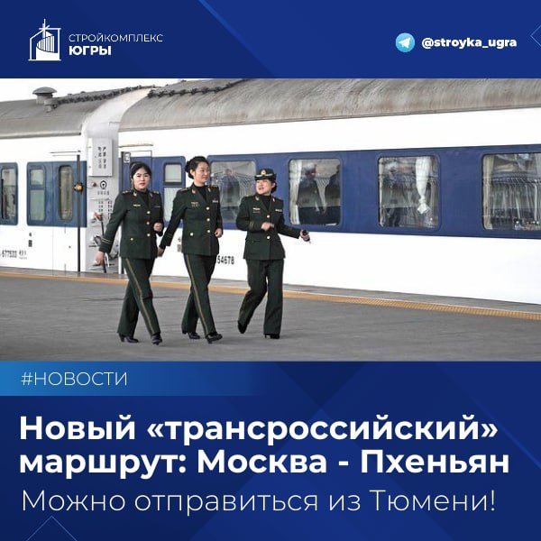 Новый «трансроссийский» маршрут: Москва - Пхеньян В некотором смысле историческое событие произошло в мире железных дорог. ⚡️Сегодня стартовали прямые поезда из Северной Кореи в Российскую столицу, и что самое интересное для нашего региона – их путь пролегает через Тюмень, куда югорчанам несложно добраться из Нижневартовска, Мегиона, Лангепаса, Сургута, Пыть-Яха. ➡️ В дальнейшем рейсы из столицы Северной Кореи в Москву будут ходить дважды в месяц, 3-го и 17-го числа каждого месяца, а в обратном направлении — 12-го и 26-го числа. Что нужно знать о новом маршруте Москва — Пхеньян: 🔘 Рекордсмен: Это самый длинный беспересадочный маршрут в мире – более 10 000 км! 🔘 Длительность: Путешествие по полному маршруту займет около 8 суток. 🔘 Остановки: Кострома, Пермь, Екатеринбург, Тюмень, Иркутск и другие города. 📍 Также Россия и КНДР договорились о запуске поездов между Хабаровском и Пхеньяном. Время в пути — чуть больше двух дней. Отправление из Пхеньяна — 19-го числа каждого месяца,