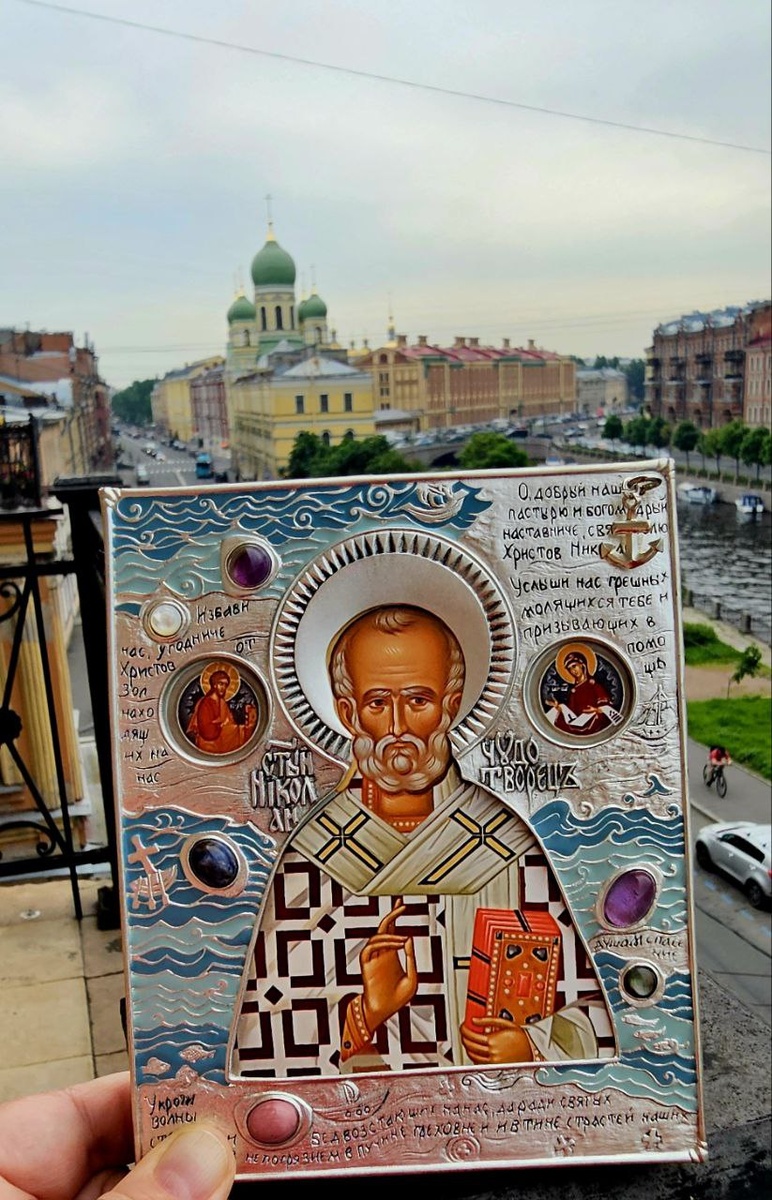 ПИТЕР. УТРО. ЧУДЕСА. Друзья! Начну этот день с Чуда! Эту икону купила в Морском Соборе в День Николая Чудотворца в прошлый приезд. И... она просто чудесная. Такая работа мастера. Лёгкость. Свобода. Свет. И этот серебряный оклад. Полудрагоценные камушки, разбросанные по поверхности, и маленький якорек... Ах, какие художники живут в Петербурге. Удивительный город. Прекрасные, талантливые люди. Из Питера с любовью и утренним благословением всем моим здесь. С Добрым Утром!
