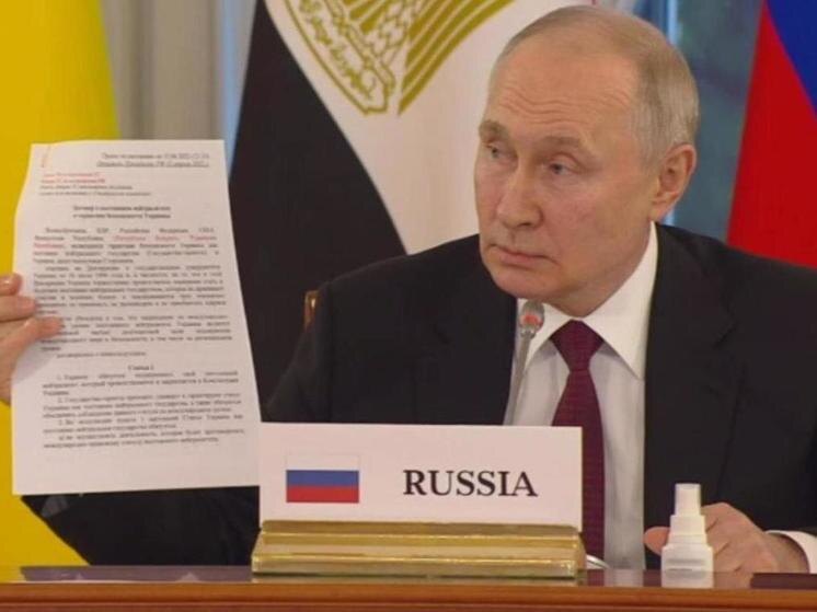 - Президент России Владимир Путин на встрече в субботу с лидерами и представителями миссии африканских стран впервые продемонстрировал парафированный проект договора с Украиной, который готовился в марте 2022 года в Стамбуле. Мы не договаривались с украинской стороной, что этот договор будет носить конфиденциальный характер, но мы никогда его не предъявляли, не комментировали. Проект этого договора был парафирован руководителем переговорной группой из Киева. Он поставил там свою подпись. Вот он", - указал российский лидер, демонстрируя представителям африканской миссии документ.