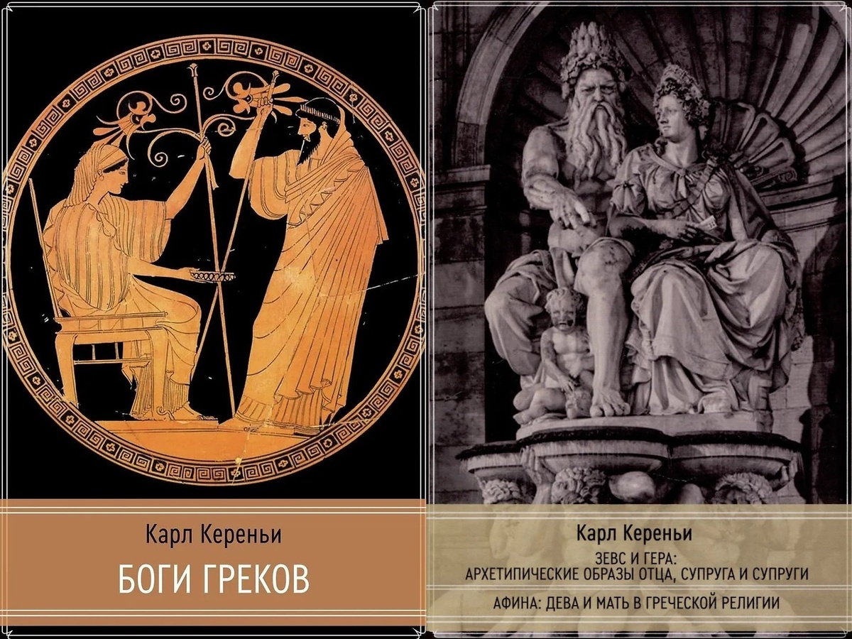Боги греков. Книга ставит перед собой задачу без прикрас и перевираний сюжета рассказать взрослому читателю о греческой мифологии с момента рождения бытия до жизни олимпийцев, о страстях, о невероятных приключениях, полных волшебства. Зевс и Гера: архетипические образы отца, супруга и супруги — исследование архетипов древнегреческой мифологии с точки зрения психологии и культурологии. Прометей. Архетипический образ человеческого существования. В работе Кереньи изучает историю Прометея и сам процесс мифотворчества как отражение архетипической функции, пытаясь понять, как эта древняя легенда приобрела всеобъемлющее значение сначала в воображении греков, а затем в западной традиции романтической поэзии. Исследования лабиринта. Книга исследует вариации древнего мифа о Минотавре, а также его более драматические версии, от Сенеки до Т. С. Элиота. Таис Афинская. Действие происходит в IV веке до нашей эры, в эпоху великих завоеваний и культурных достижений. Таис, обладая красотой и умом, стано