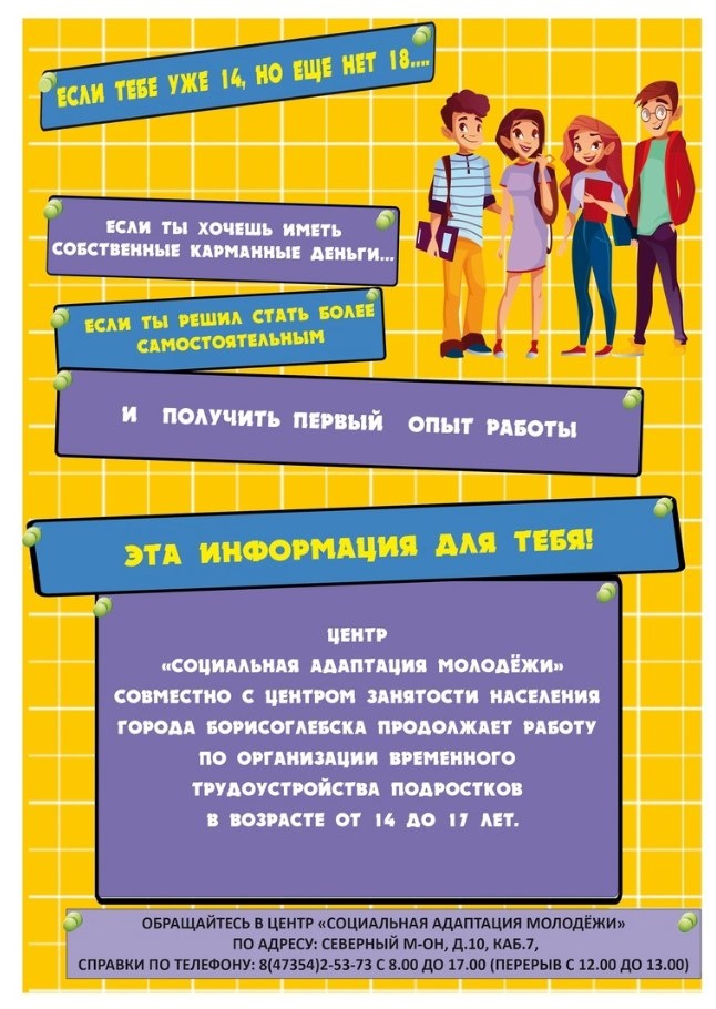 Лето началось и у юных борисоглебцев появился прекрасный шанс не только отлично провести время, но и заработать свои первые деньги. Центр социальной адаптации молодежи объявляет набор на временную работу подростков в возрасте от 14 до 17 лет. Июль и август — время возможностей!