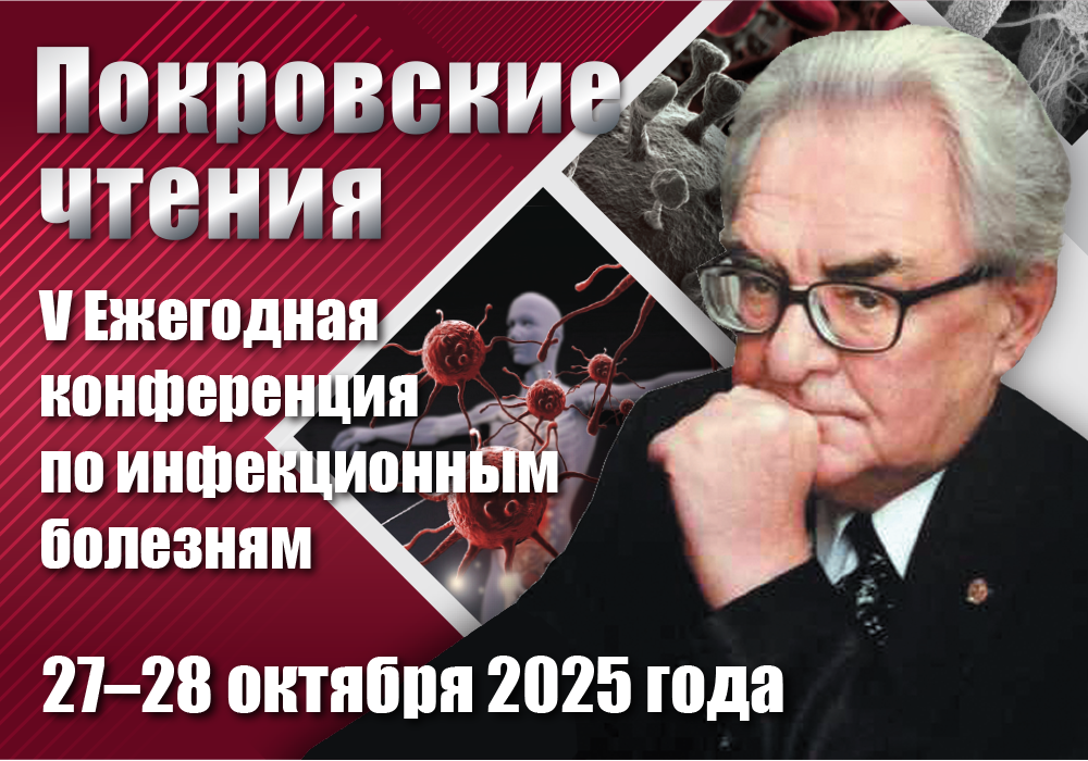 - Уважаемые коллеги! 27-28 октября 2025 года в очном формате состоится V Юбилейная Ежегодная конференция по инфекционным болезням «ПОКРОВСКИЕ ЧТЕНИЯ», которая пройдет под эгидой НАЦИОНАЛЬНОЙ АССОЦИАЦИИ СПЕЦИАЛИСТОВ ПО ИНФЕКЦИОННЫМ БОЛЕЗНЯМ ИМЕНИ АКАДЕМИКА В.И.ПОКРОВСКОГО
