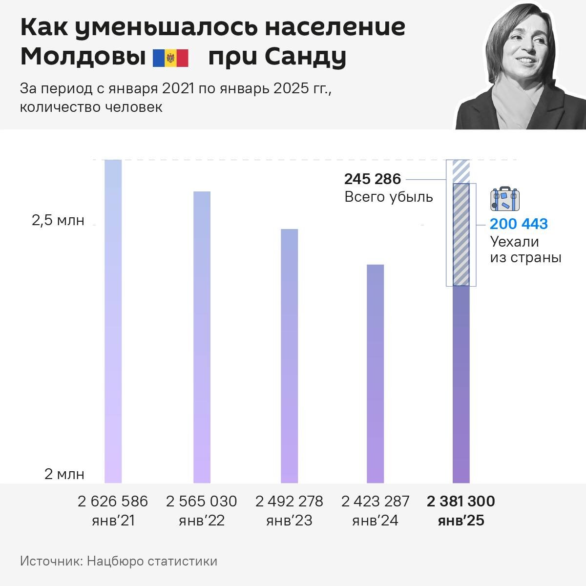Национальное бюро статистики опубликовало цифру постоянного населения Молдовы по состоянию на 1 января 2025 года — 2 381 300 человек. На 1 января 2021 года, когда Санду начала свой первый мандат, население составляло 2626586 человек. Соответственно, далее: на 1 января 2022 года — 2565030 человек, на 1 января 2023 года — 2492278 человек, на 1 января 2024 года — 2423287 человек. ▪️Таким образом, за первый срок президентства Санду население Молдовы сократилось на 245286 человек, или примерно на 10%. По данным официальной статистики, за эти четыре года в Молдове родилось 104109 человек, умерло 148952 человека. Превышение смертности над рождаемостью составило 44843 человека. ▪️Разница между общим сокращением населения и превышением смертности над рождаемости — это эмиграция: Молдову за первую каденцию Санду покинуло 200 443 человека. "Санду и ее партия PAS говорят, что им нужно еще четыре года, чтобы завершить начатое. Если их начало — это минус четверть миллиона жителей Молдовы, то каким