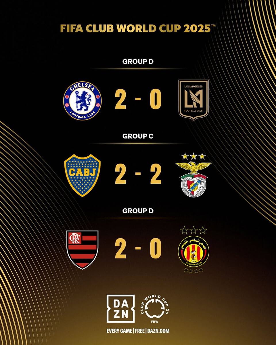 "Челси" стартует с победы, разбираясь, с "Лос-Анджелес ФК", который "прыгнул" в последний вагон и получил право участвовать в турнире. Оливье Жиру встретился с бывшей командой, но помочь ничем не смог. Лиам Делап дебютировал за "аристократов" сразу с голевой передачей. Нападающий "Челси" Педру Нету – лучший игрок матча, 1 гол. Самая боевая встреча дня получилась между "Бока Хуниорс" и "Бенфикой". "Генуэзцы" быстро создали солидный задел в счете, но после перерыва аргентинские игроки "Бенфики" сделали счет равным, а Отаменди и вовсе в меньшинстве. Нападающий "Бока Хуниорс" Мигель Мерентьель – лучший игрок матча, 1 гол. "Фламенго" на классе побеждает гранд из северной Африки. "Эсперанс" ничего не создал у ворот бразильского клуба. Полузащитник "Фламенго" Джорджиан Де Арраскаэта – лучший игрок матча, 1 гол.