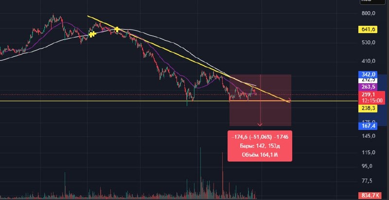 $VKCO 📉Глобальный тренд нисходящий. ⚠️С момента, как актив вышел на рынок он постепенно падает, хотя достаточно много инвесторов верили в его рост. ➡️В данный момент строит поджатие к уровню поддержки 238,3, если этот уровень пробьет, то подтвердит фигуру треугольник и пойдёт отрабатывать. 🔽Отработка треугольник примерно до 170, но может сходить ниже. 🟢Сломом фигуры будет пробитие верхнего уровня сопротивления 294 и закрепления выше этого уровня . 👀Учитывая тренд я бы открывать лонговые позицию здесь не стала, ВКонтакте отлично подходят для спекуляцией. НЕ ИИР #теханализ #инвестиции #трейдер #вк
