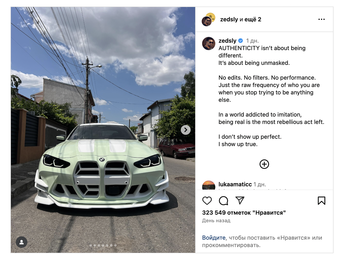 Зеленый кузов (больше отдающий в мяту даже), белые аэродинамические элементы, минимум глянца и максимум личного взгляда. Снимки этой машины разошлись по соцсетям с комментариями в духе "Зачем?" и "Кто так делает?". А ответ, кстати, есть. И он — в подписи владельца: "Подлинность — это не о том, чтобы отличаться. Это о том, чтобы снять маски". И если вдуматься — выглядит странно не он. Странно выглядим мы, когда боимся выйти за привычную рамку. Мы хотим "немного индивидуальности", но строго в пределах допустимого: не выбивайся, не выделяйся, не перегибай. А этот M3 — как раз тот случай, когда человек перестает пытаться быть "правильным". И начинает быть собой. Белый диффузор, белый сплиттер, белые юбки. Да, они режут глаз. Особенно тем, кто привык, что у M3 карбон должен быть обязательным. Но, может, в этом как раз и смысл? М3 — машина, кот