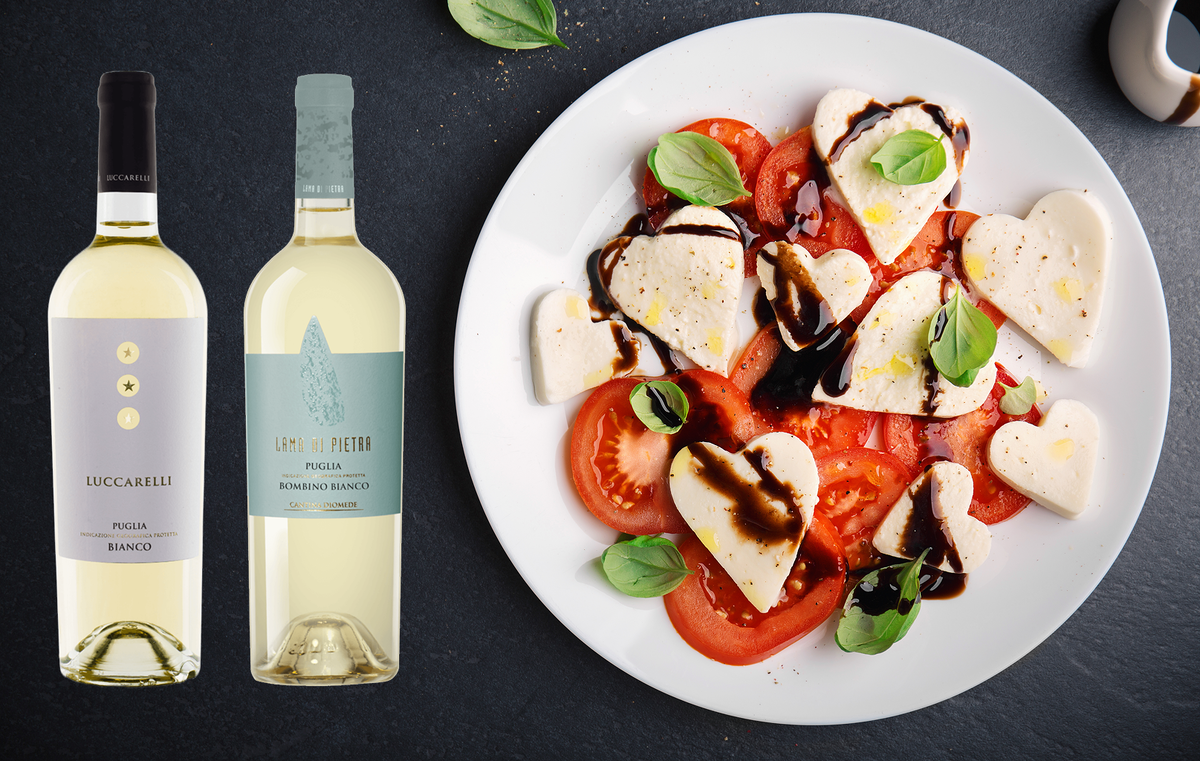 *Если хотите сделать блюдо более пикантным, то аккуратно полейте ингредиенты бальзамическим соусом. Рекомендуем к этому салату два белых вина. 1. Свежий вкус Bombino Bianco Puglia Lama di Pietra, 2024, с нотами цитруса и лёгкой минеральностью прекрасно дополняет вкус помидоров и моцареллы.