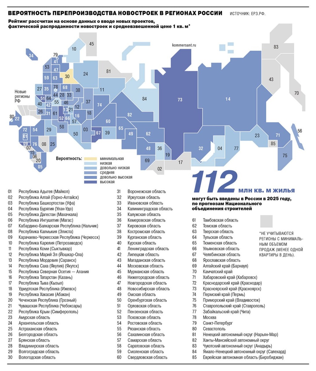 Объем новостроек значительно превышает спрос, даже при снижении темпов запуска новых проектов. • По данным ЕРЗ.РФ, высокий риск затоваривания — в Краснодарском крае, Ленинградской, Свердловской и Новосибирской областях. • В Орловской, Пензенской, Челябинской областях, Карачаево-Черкесии и Красноярском крае ситуация уже критическая. • Средний уровень риска — в 21 регионе, включая Московскую область и Санкт-Петербург. • Единственная надежда участников рынка — снижение ключевой ставки ЦБ, которое может оживить ипотечное кредитование и подтолкнуть спрос.