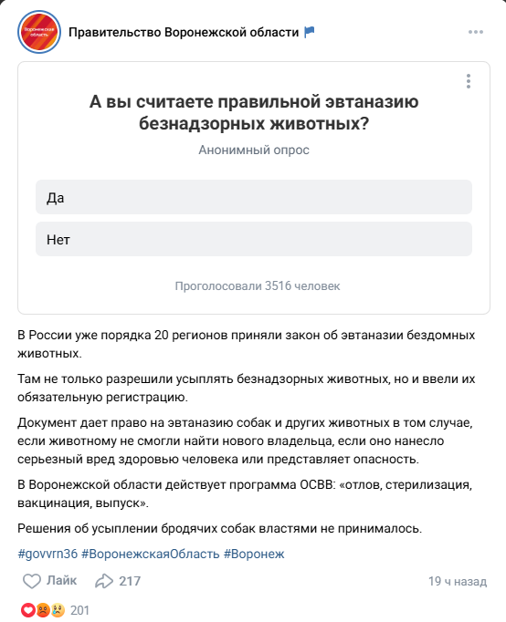В нашем регионе не усыпляют бродячих собак. Около 20 регионов в России приняли закон об эвтаназии бездомных животных, там ввели обязательную их регистрацию и разрешили усыпление, если, например, собаке не нашли нового хозяина, если она представляет опасность или же уже нанесла серьезный вред здоровью. Правительство Воронежской области напоминает, что в нашем регионе действует программа ОСВВ, подразумевающая «отлов, стерилизация, вакцинация, выпуск». В Воронежской области не усыпляют бродячих собак. Вместе с тем правительство в своем аккаунте запустило опрос. Власти решили узнать мнение местных жителей – как они относятся к эвтаназии безнадзорных животных? В опросе приняли участие более 3 тыс человек. И большинство (57,8%) высказалось против такого способа борьбы с бродячими собаками. С какой целью и что по итогу дадут результаты данного опроса - неизвестно. Подписывайтесь на телеграм-канал «Блокнот Воронеж» и узнавайте всё первыми Филипп Котов