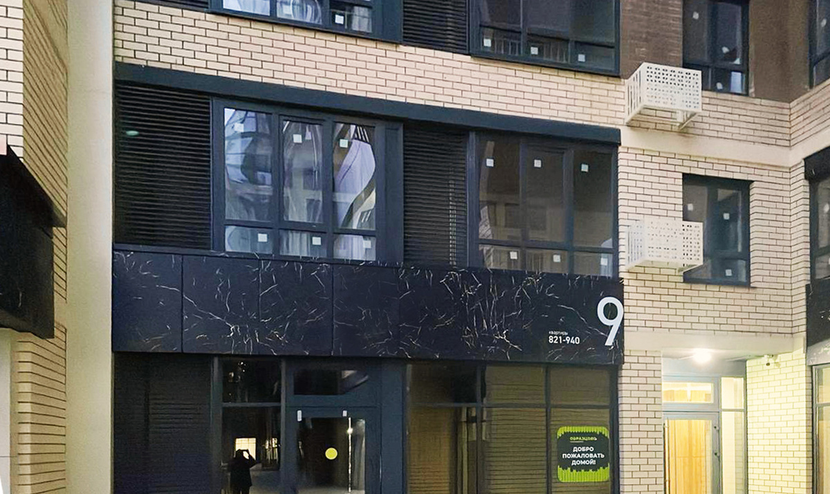 Украшением зданий комплекса стали алюминиевые композитные панели SIBALUX с текстурой черного мрамора. Входные группы облицованы нашими панелями цвета «розовая медь».