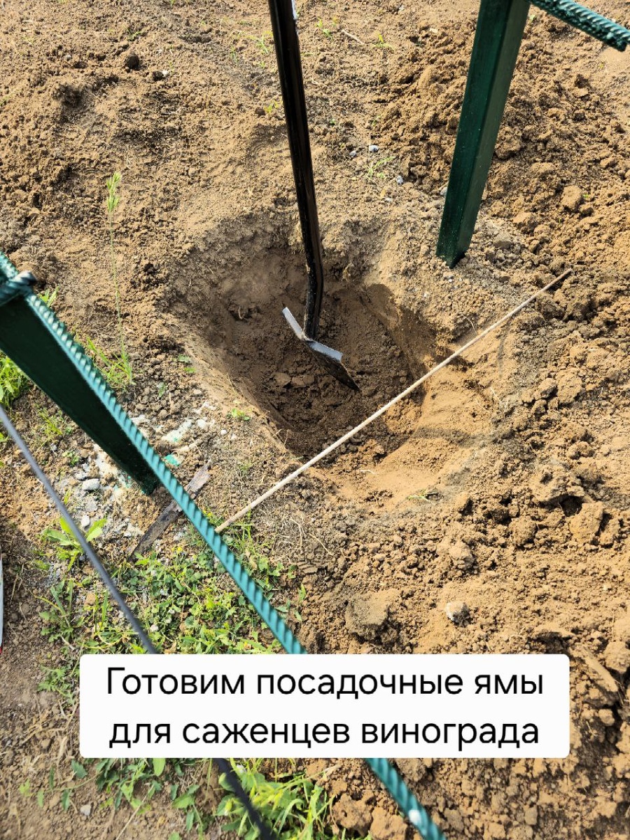 🌳САД🍎 📝Ранее мы рассказывали вам, что закончили оборудование нашей новой шпалеры и неделю назад посадили возле неё три вегетирующие саженцы винограда двух сортов: "Русский великан" и 2 саженца сорта "Октавиан", которые нам любезно предоставил наш давний друг - виноградарь с большим опытом выращивания различных сортов винограда. 🍇Перед посадкой в центре нашей двухплоскостной шпалеры мы выкопали посадочные ямы глубиной и диаметром 45-50 см. 🍇Затем подготовили грунт, которым будем засыпать саженцы, смешав землю с питательным грунтом и добавив небольшое количество речного песка. 🍇На дно ямы добавили по горсти азофоски, затем небольшое количество подготовленного грунта, аккуратно поместили на него наш саженец, вместе с комом земли и засыпали остатком грунта до уровня побегов. 🍇Грунт немного притромбовали и обильно (2 ведра по 10 литров) пролили подогретой на солнце водой. 🍇Через пару недель планируем подкормить высаженные кустики и если не будет дождей также обильно полить. Бу