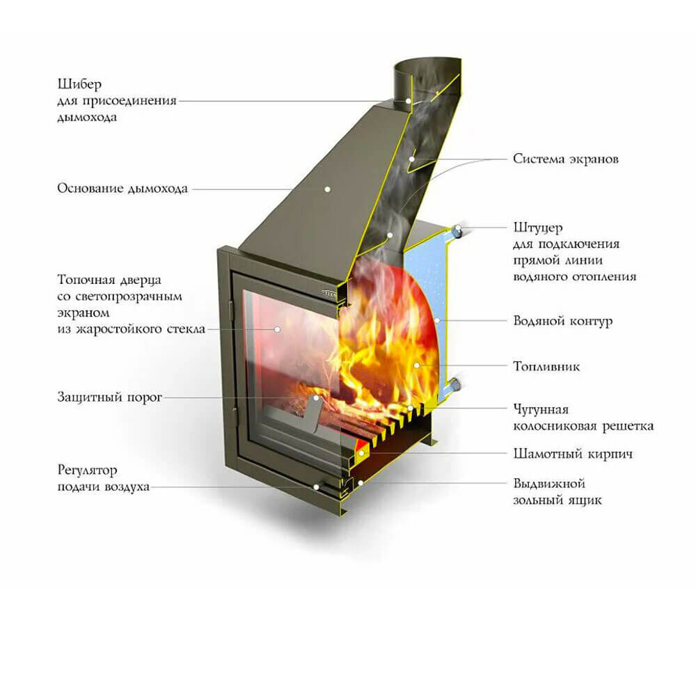 Конструкция топочного элемента рассчитана на высокие температуры, постоянные нагрузки, длительную эксплуатацию. Устройство каминной топки включает: