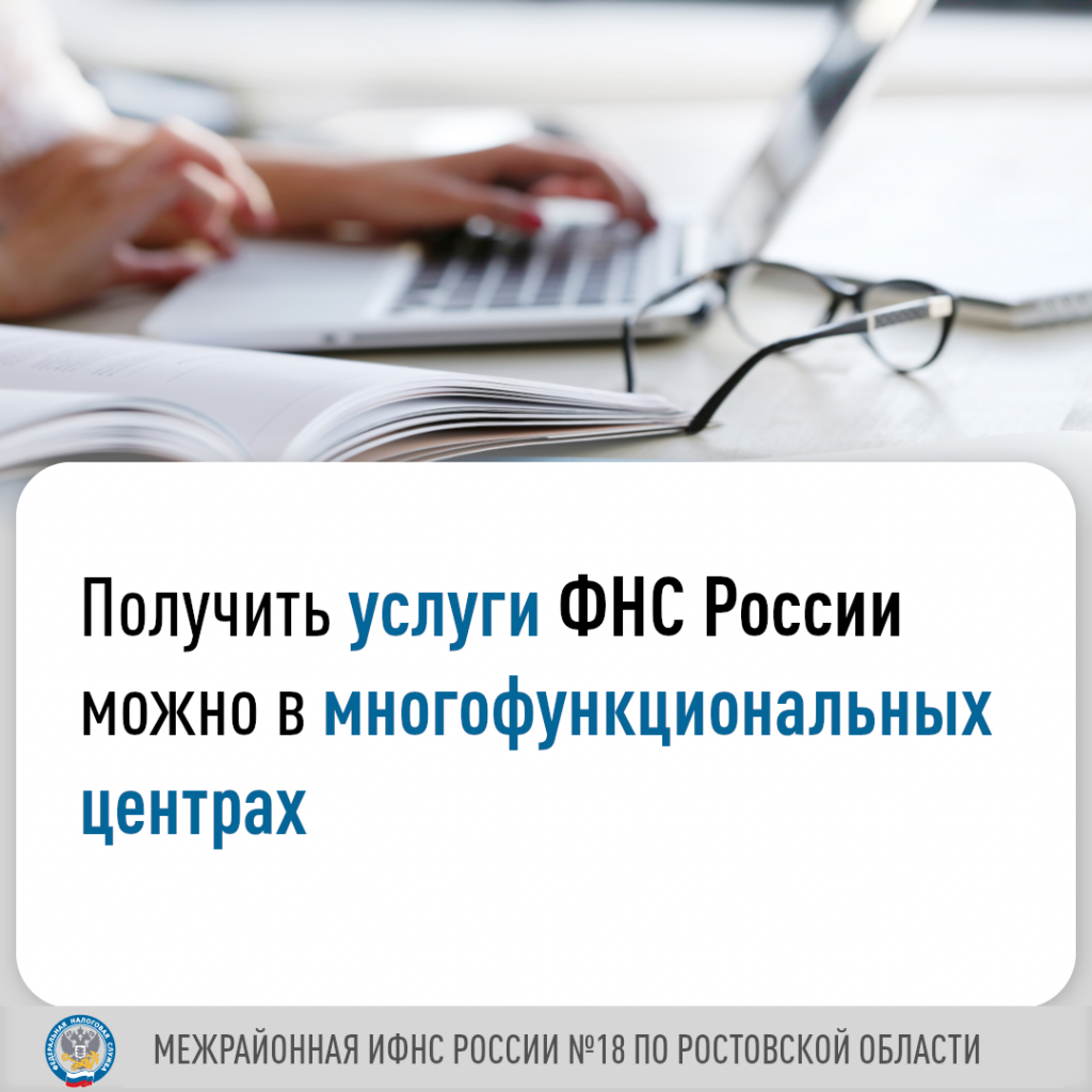 Для получения услуг ФНС России жители Ростовской области могут обратиться не только в налоговые органы, но и в многофункциональные центры (МФЦ). В перечень государственных услуг, предоставляемых на базе сети МФЦ Ростовской области, входят 5 следующих услуг: Все услуги, предоставляемые МФЦ, бесплатны, и получить их может как сам заявитель, так и его представитель на основании доверенности. Межрайонная ИФНС России № 18 по Ростовской области