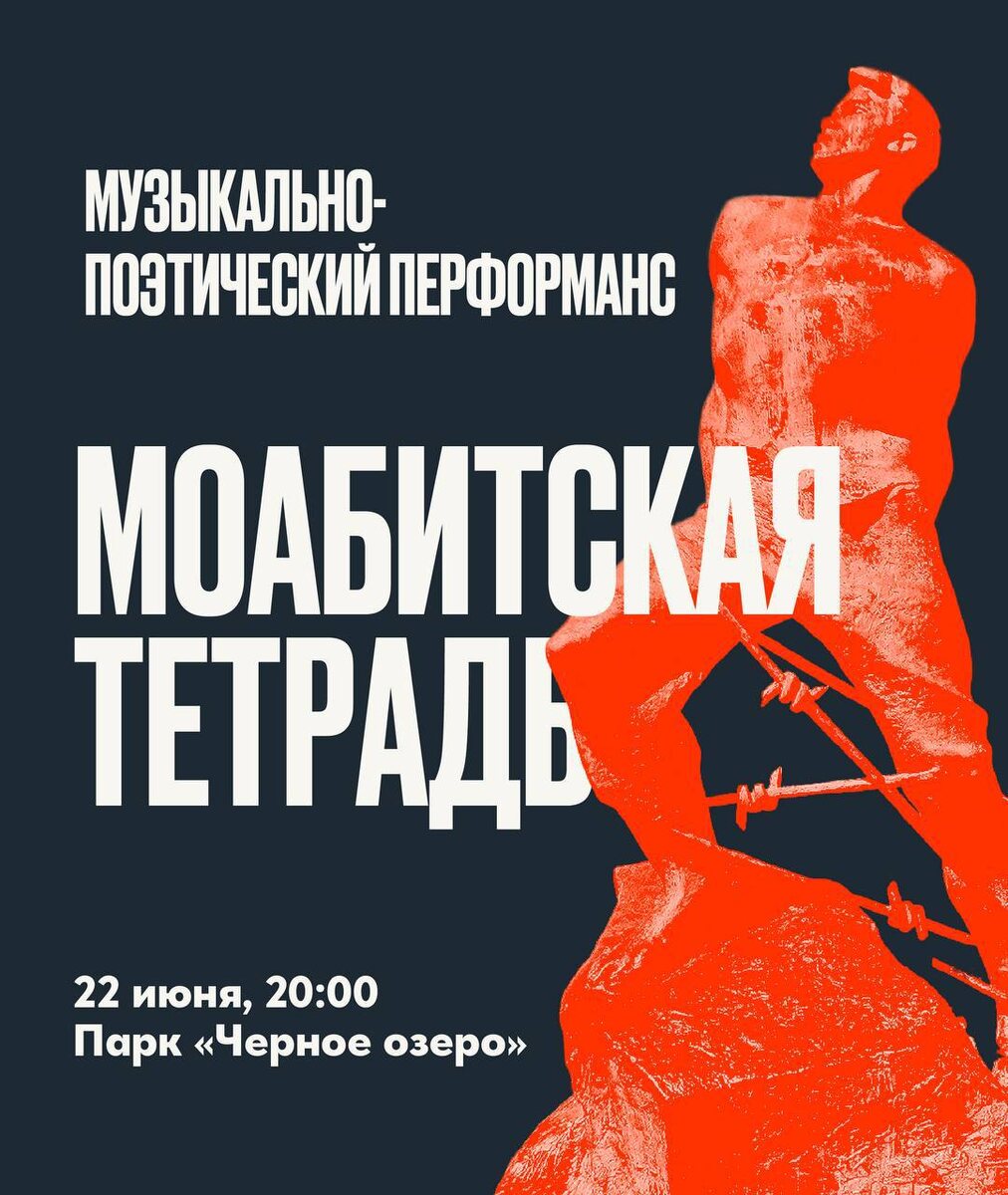 Музыкально-поэтический перформанс «Моабитская тетрадь» 🗓️ 22 июня ⏰ 20:00 💸 бесплатно 🏫 парк «Черное озеро» 📍 амфитеатр Постановка приурочена ко дню начала Великой Отечественной войны и посвященный памяти татарского поэта Мусы Джалиля. Экспериментальная постановка, объединяющая поэзию, авторскую музыку, танец, вокал и драматическое искусство. В центре перформанса — стихи великого поэта Мусы Джалиля, которые оживут на сцене не только через голос, но и через движение, музыку и даже дыхание. Гостей ждут выступления танцовщиков-перформеров, актеров театров, а также музыкантов. ➡️ ПОДРОБНОСТИ ⬅️ ❗️ Детская Афиша | Казань Больше информации в нашей группе, переходите