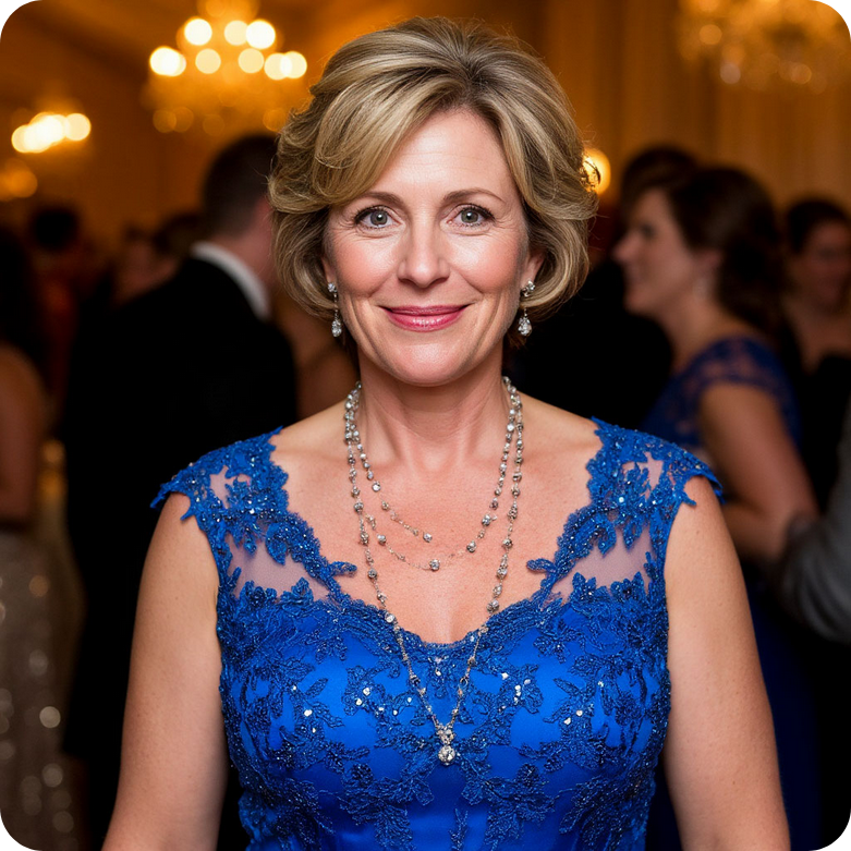 Синий переливающийся шёлк идеально облегал фигуру матери, кружево выглядело изысканно, а бисер сверкал под светом софитов, как звёзды.