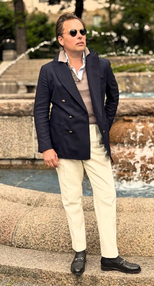 Этим постом отвечу на вопрос сразу нескольких подписчиков, которые запрашивали рекомендации по bespoke-пошиву блейзера! Что нужно для пошива идеального блейзера? Давайте по порядку: 1. Идея. Нужно ответить себе на вопрос - какую модель выбрать. Можно ведь пошить как двубортный, так и однобортный блейзер! Важна также ширина лацканов, их форма и стилистика. Серебрянные или золотые пуговицы. 2. Ткань. Для блейзера лучше всего подходит фактурная ткань: это могут быть так называемые «птичий глаз», «рогожка» или фактурное полотно диагонального плетения. Классическая гладкая костюмная ткань, не обладающая фактурой, на мой взгляд, будет смотреться значительно менее выигрышно. Лучшие ткани нужно искать в каталогах Loro Piana, Scabal, Vitale Barberis Canonico (или их подбренд Drapers), Holland and Sherry. 3. Пуговицы. Это очень важный элемент блейзера, который значительно определяет его облик! Основной спорный момент заключается в том, какие пуговицы выбрать: золотые или серебряные. На пе