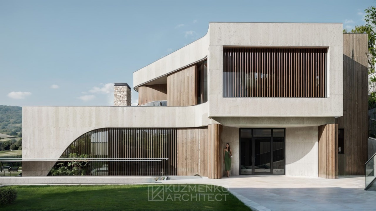Дом в Головинке — современная архитектура на склоне у моря Проект KUZMENKO ARCHITECT Проект частного дома в Головинке (Сочи) разработан архитектурным бюро KUZMENKO ARCHITECT как пример современной архитектуры, органично вписанной в сложный рельеф и природную среду Черноморского побережья. Дом расположен на участке с выраженным уклоном, что потребовало точного архитектурного решения и продуманной посадки здания. Архитектура формируется не вопреки рельефу, а в диалоге с ним: здание «следует» за склоном, открывая панорамные виды на море и горы, сохраняя при этом приватность и комфорт. Архитектурная концепция дома в Головинке Архитектура построена на сочетании плавных линий и строгой геометрии. Горизонтальные объемы визуально «разгружают» массив здания и подчеркивают его связь с ландшафтом. Большие панорамные окна ориентированы на ключевые видовые точки и обеспечивают естественное освещение внутренних пространств в течение всего дня. В отделке фасадов использованы: • светлый архитек