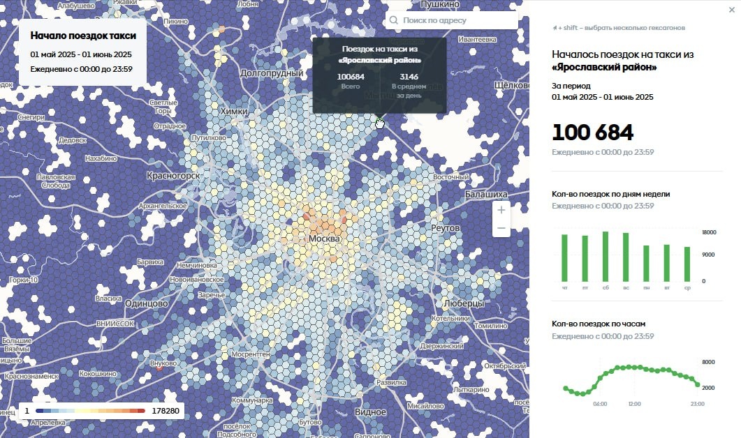 📍 КАРТА СПРОСА Помните, писал про карту с пассажиропотоком? А ещё раньше был слайд топ-10 мест, откуда заказывают такси? Так вот, оказывается, есть карта спроса от ЦОДД, где они анализируют данные агрегаторов, которые те передают в ГИС ЕРНИС: https://prodvizhenie.mos.ru/ Кому интересно, можно поиграться: сравнить разные периоды, посмотреть из каких точек куда чаще заказывают авто, в какое время и т.д. 🤨 Из интересного заметил точку "Ярославский район" (она как раз на скрине), которая находится на самой окраине, но конкурирует по спросу с другими точками в центре. Посмотрел куда от туда едут, в основном в "Останкинский район", там какой-то крутой ЖК для телевизионщиков?) 📈 В итоге сделал для вас ту самую карту пассажиропотока в МСК, переходите по 👉ССЫЛКЕ👈 (откроются Яндекс.Карты) и добавляйте себе (кнопка "подписаться"), на ней не просто отметил точки, но и в комментариях подписал пиковое время для самых топовых объектов. Не стал прям много точек делать, так как в основном всё