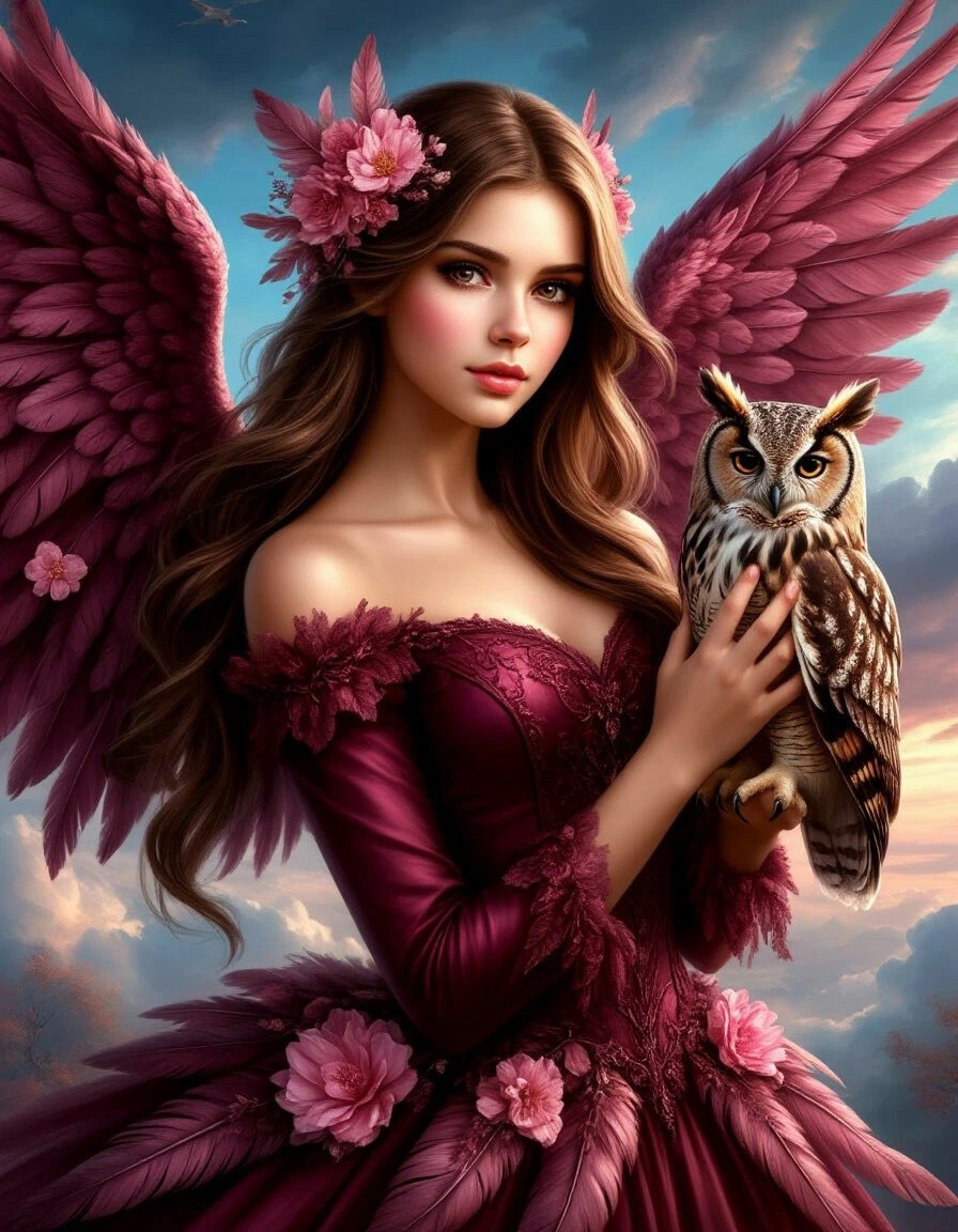 Для девочек - любительниц крылышек. A beautiful girl with long brown hair, dressed in an elegant burgundy dress with wings of large owl feathers, she is decorated with pink flowers, holding a small owl in her hands. In the background is a cloudy blue sky, her face illuminated by a soft light. She has exquisite facial features and she looks very charming. in digital art painting style, fantasy realism, dark pink and gray, detailed costumes, photorealistic techniques, fairy tale background, I can't believe how beautiful this is #neuroart #нейроарт #ai #ии #нейросеть #картинки #искусственныйинтеллект #цифровоеискусство #digitalart #арт #art #prompt #промпт #подсказка