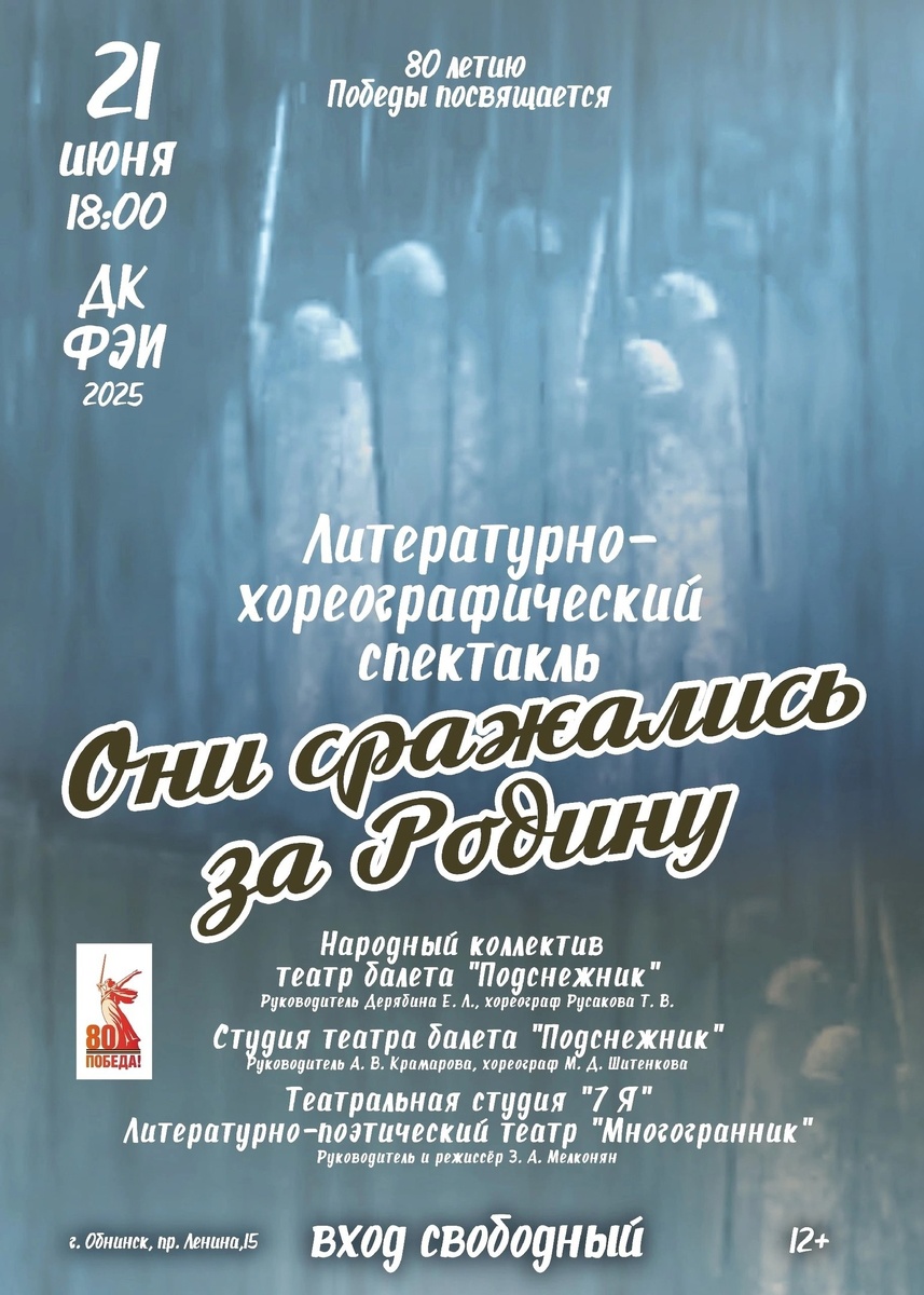 Спектакль «Они сражались за Родину» 21 июня 21 июня в ДК ФЭИ состоится литературно-хореографический спектакль «Они сражались за Родину», приуроченный к 80-летию Великой Победы. Спектакль посвящён многонациональному единству народов Советского Союза в годы Великой Отечественной войны 1941-1945 годов. В основе постановки – реальные истории, документальные свидетельства, проза и поэзия военных лет, хореографические композиции и песни. На сцене выступят: народный коллектив театра балета «Подснежник», студия театра балета «Подснежник», театральная студия «7-Я» и литературно-поэтический театр «Многогранник». Зрителям представят рассказы не только о солдатах, но и о мирных жителях, детях и даже животных, которые внесли свой вклад в Победу. Начало в 18:00. Вход свободный. #обнинсккультурный #80летПобеды #Победа80