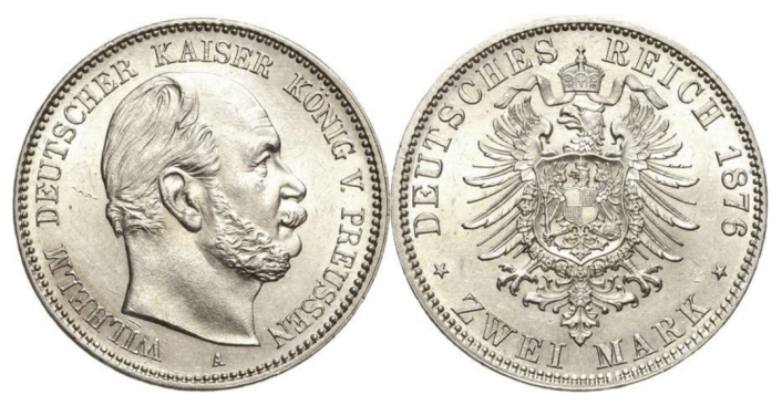 Монета номиналом в 2 марки выпускалась при императоре Вильгельме I в течение 1876 - 1884 годов, только в 1878, 1881 и 1882 году не было выпуска.