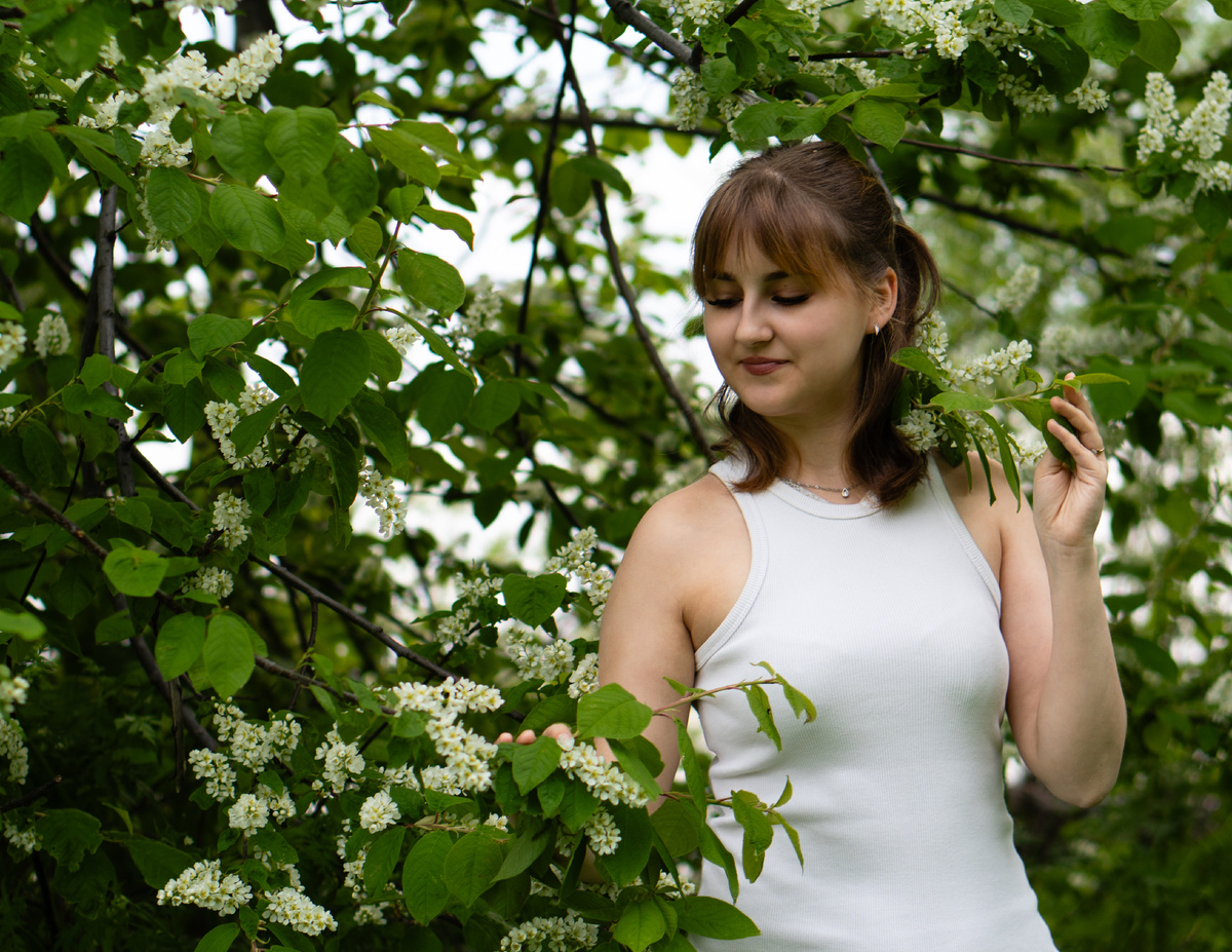 Я помог ей избавиться от лесных паразитов и вскоре мы вышли на зеленую лужайку, у самого берега великой реки. По краям её благоухала белым цветом черёмуха, вечер был тихим и теплым. Под легкий плеск набегающей на каменистый берег амурской волны мы приступили к фотосессии.