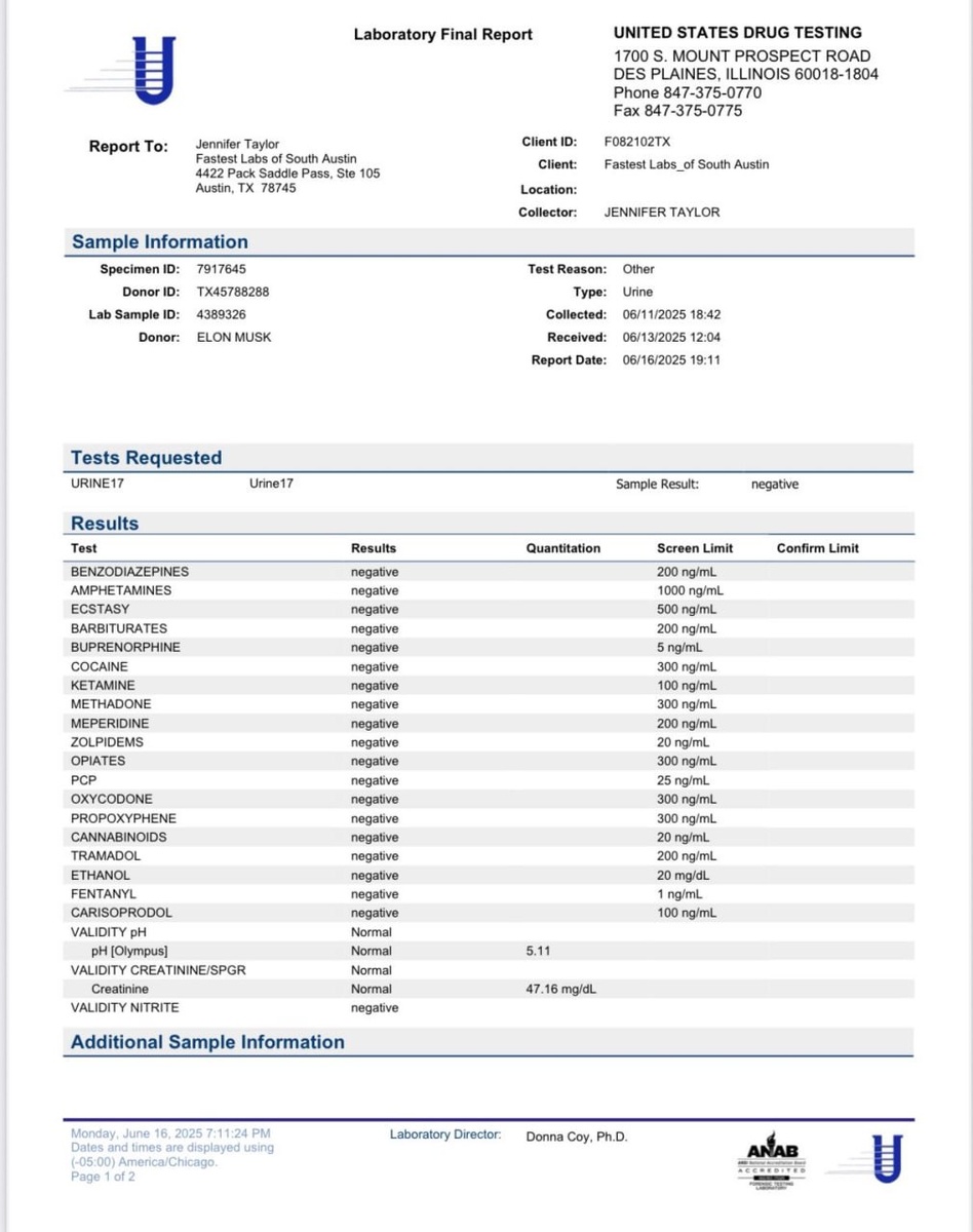 👍 Илон Маск опубликовал на своей странице соцсети X результат своих анализов на наркотики, которые показали отсутствие следов употребления
