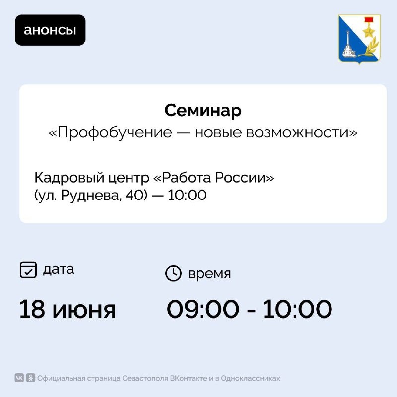 Бесплатные мероприятия от Кадрового центра «Работа России» пройдут 18 июня 🍂Делимся расписанием в карточках. Подробности — по телефону +7 (8692) 66-22-92. Правительство Севастополя