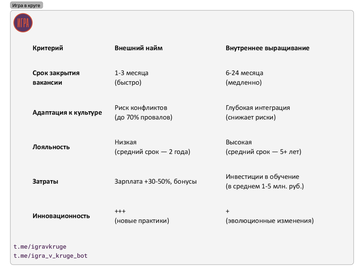 - Для внешнего найма: Игнорирование культурного соответствия («гений сгорит без поддержки»).