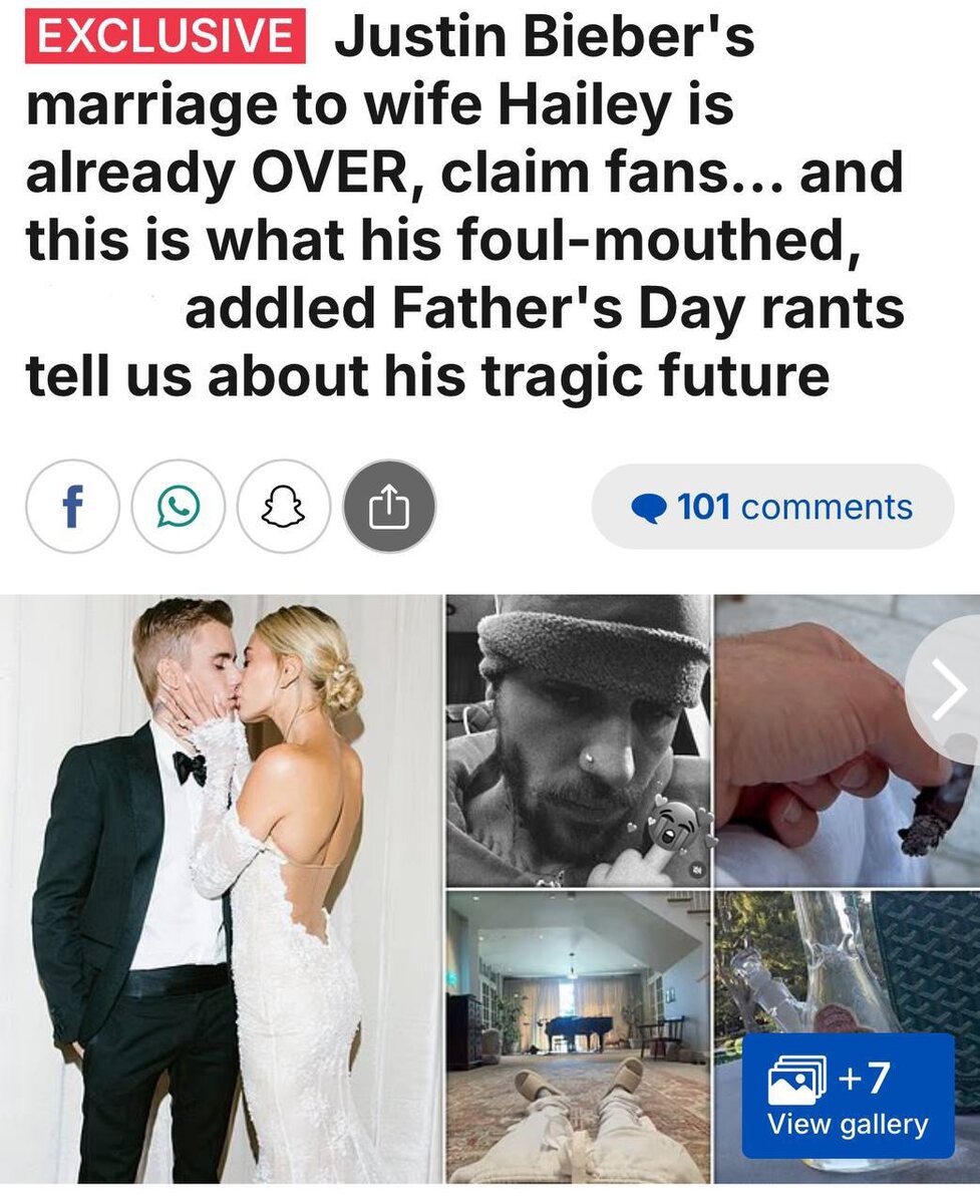 Хейли и Джастин Бибер развелись. Это утверждает издание Daily Mail. По словам СМИ, пара давно не вместе, и именно из-за этого состояние певца настолько сильно ухудшилось. В доказательство тому также приводится тот самый комментарий Хейли к посту певца: «День отца — отстой». Сами Биберы никакой информации не давали на этот счёт, да и источники сомнительные, так что слепо верить не стоит, но будем следить за новостями. «Люди постоянно советуют мне лечиться. Не думаете ли вы, что если бы я мог себя «починить», я бы давно уже это сделал? Я знаю, что сломан. Я знаю, у меня проблемы с гневом. Я всю жизнь пытался работать над собой, стать похожим на тех, кто говорил мне, что меня нужно исправить. И это только делает меня более уставшим и более злым. Чем сильнее я стараюсь расти — тем больше я зациклен на себе. Единственный, кто действительно заставляет меня хотеть жить не только ради себя — это Иисус. Потому что, если честно, я устал постоянно думать только о себе»
