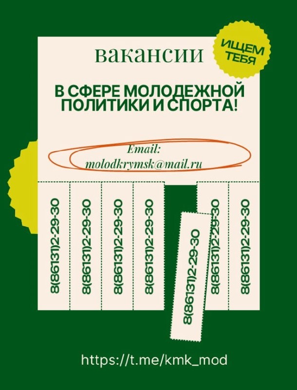 ♥️ Открыты две вакансии в сфере молодежной политики и спорта! ♾ Главный специалист отдела по работе с молодежью, культуре, физической культуре и спорту: Обязанности: организация и проведение мероприятий для молодежи, развитие культурных и спортивных проектов Требования: высшее образование, организаторские способности, умение работать ПК. Мы предлагаем: официальное трудоустройство, соцпакет, возможности для профессионального роста ♾ Специалист отдела по работе с молодежью, культуре, физической культуре и спорту Обязанности: участие в организации мероприятий в области спорта, работа с клубами спортивными. Требования: средне специальное образование, активная жизненная позиция Преимущества: возможность начать карьеру в интересной сфере, обучение и развитие Контакты для связи: 📞 8(86131)2-29-30 ✉️ molodkrymsk@mail.ru
