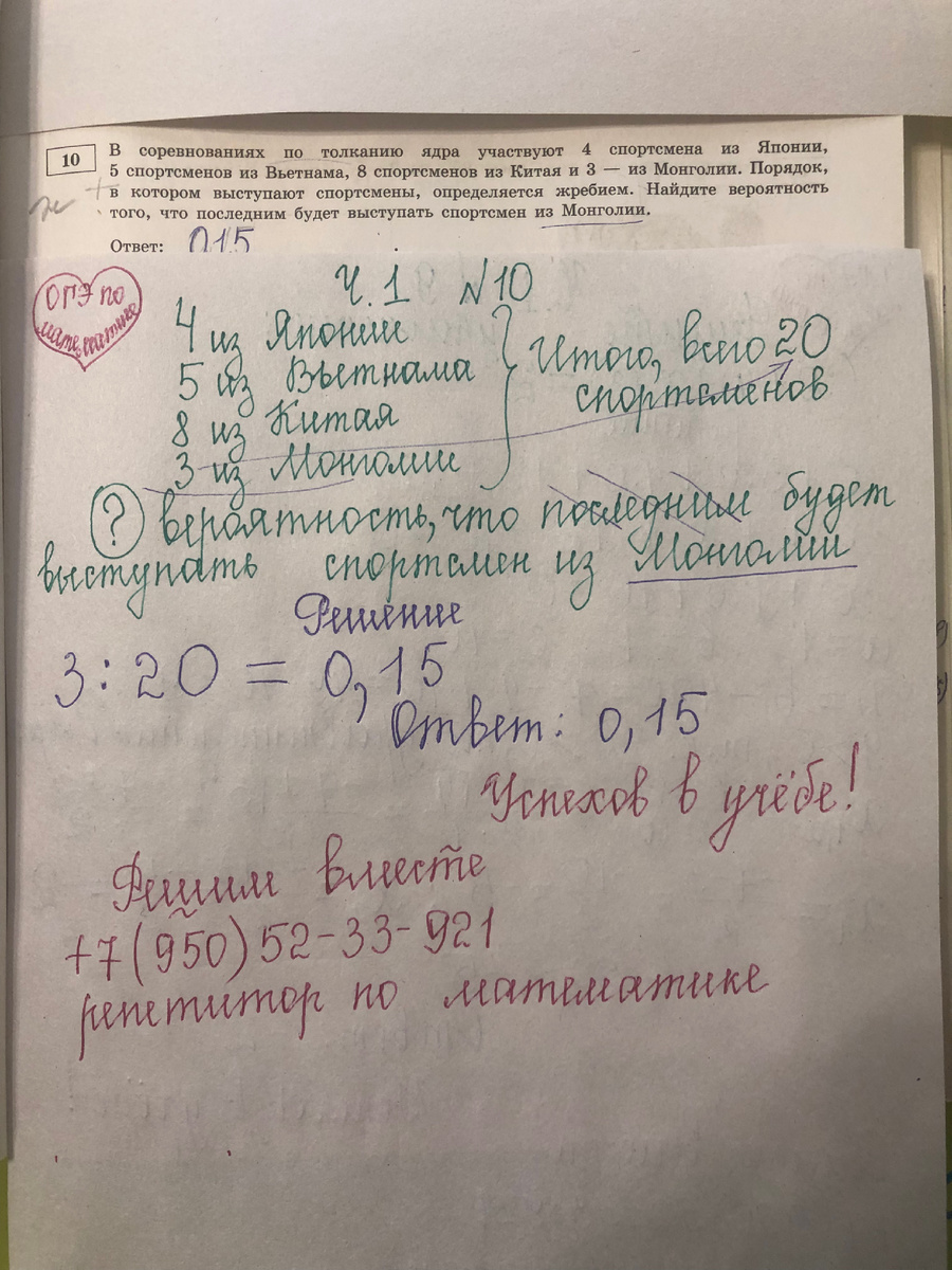 ОГЭ по математике: найти вероятность, что последним будет выступать спортсмен из Монголии (ч. 1 номер 10)